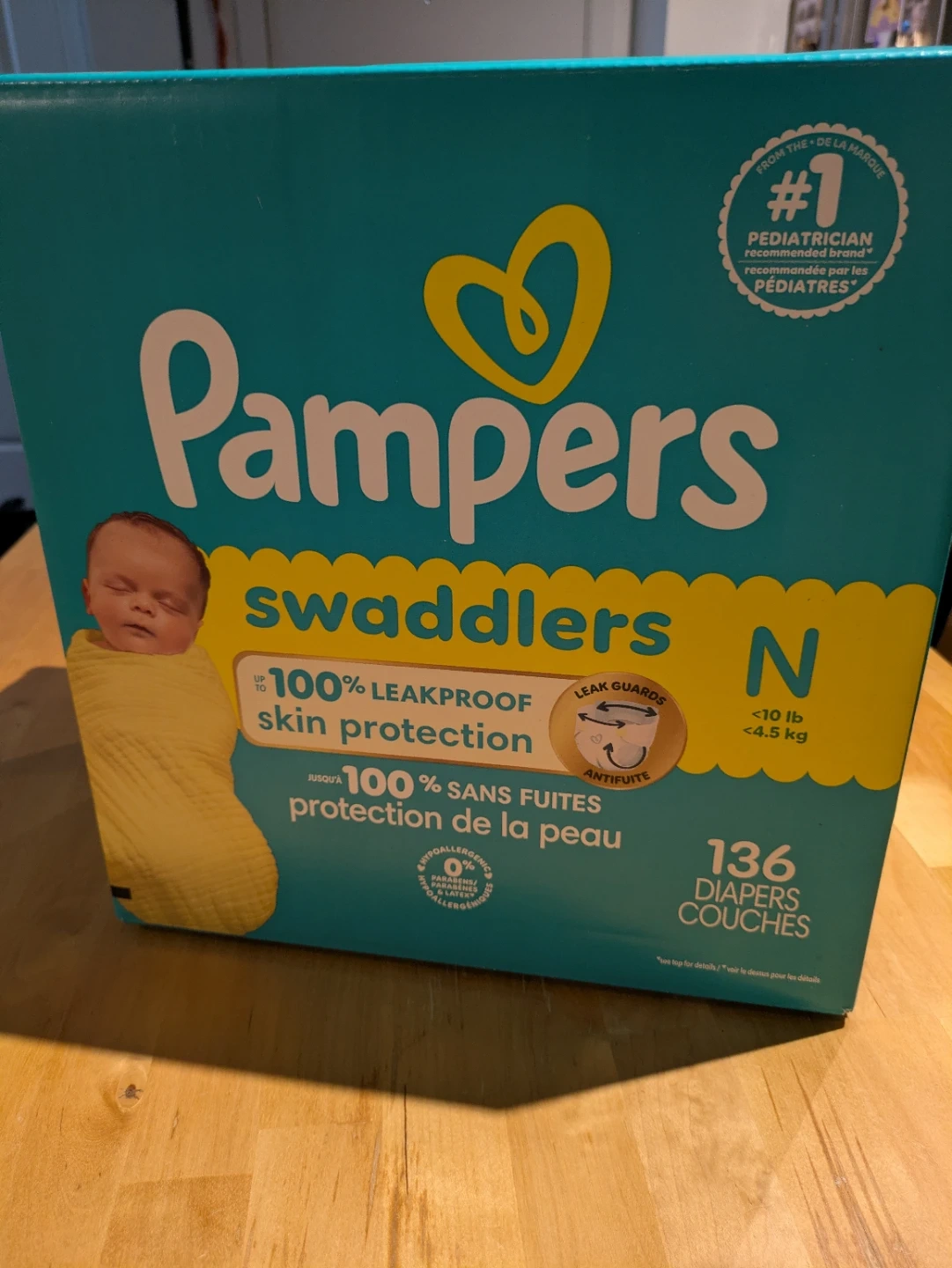 Pampers Swaddlers diapers in Size N for babies up to 10 lbs. These diapers offer 100% leakproof skin protection and are hypoallergenic. It's 136 diapers in the pack. Useful for newborns needing gentle and protective diapering. Retail price:$40