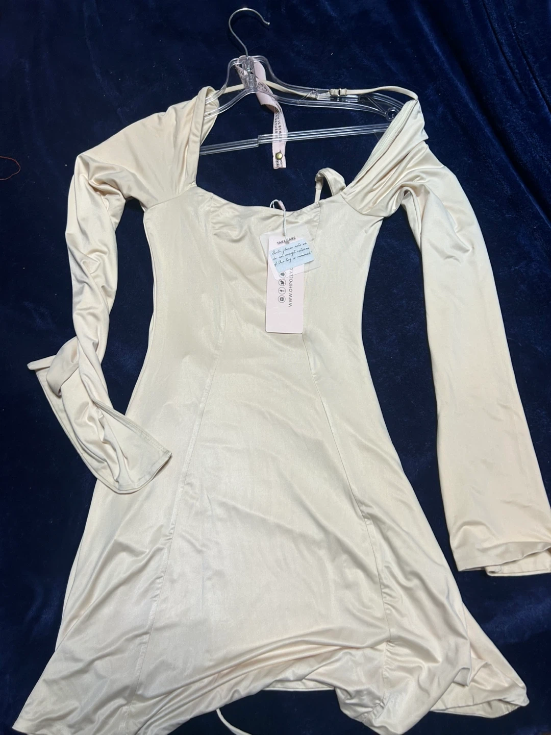 This is a champagne-coloured satin mini dress by OH POLLY. It features long, flared sleeves and a sweetheart neckline. The dress is made from a smooth satin material. It's perfect for a night out or a special occasion!