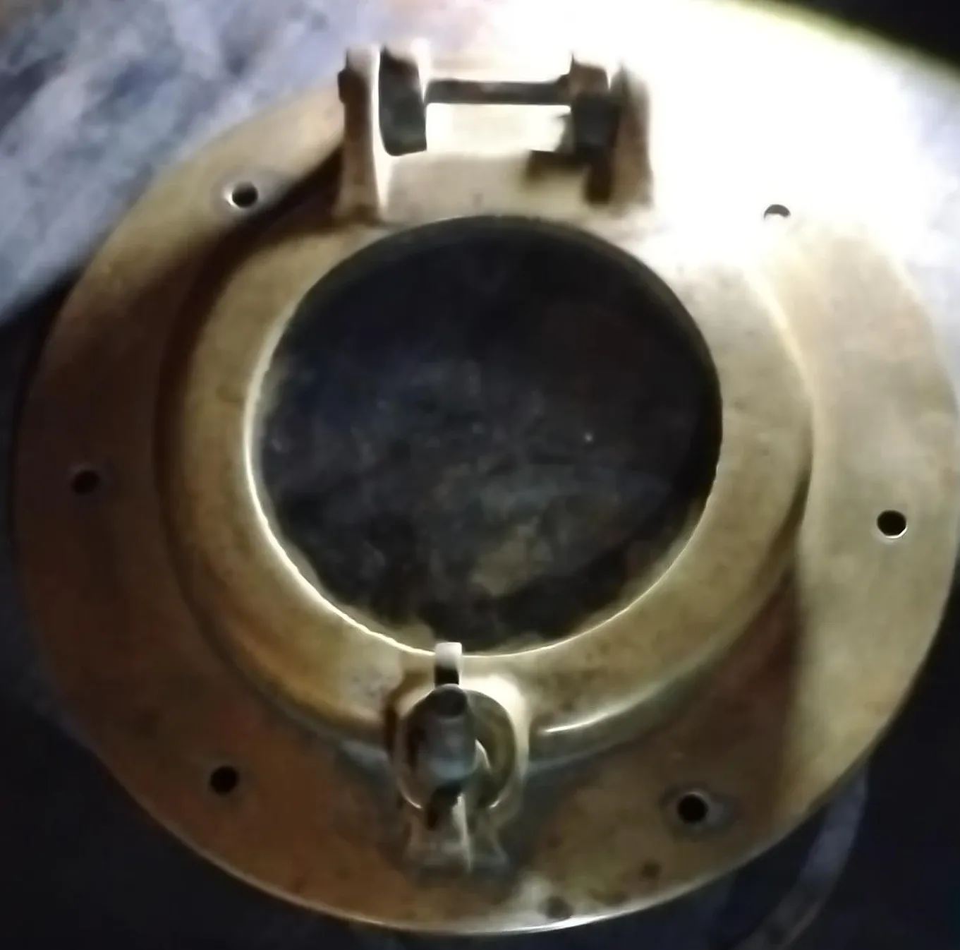 A vintage brass porthole window, likely from a ship. It has a secure latch and mounting holes. This piece could be repurposed for unique home decor or nautical projects.
