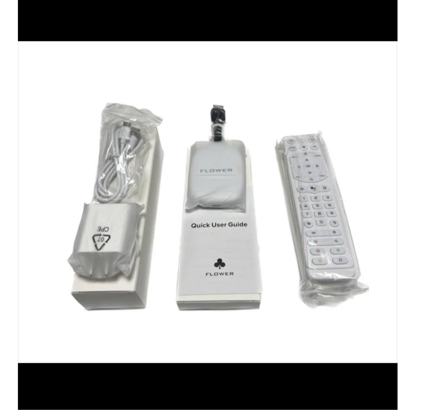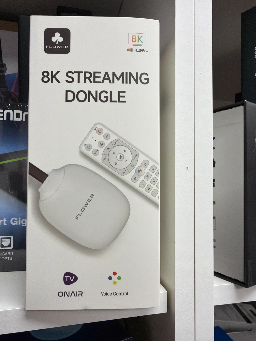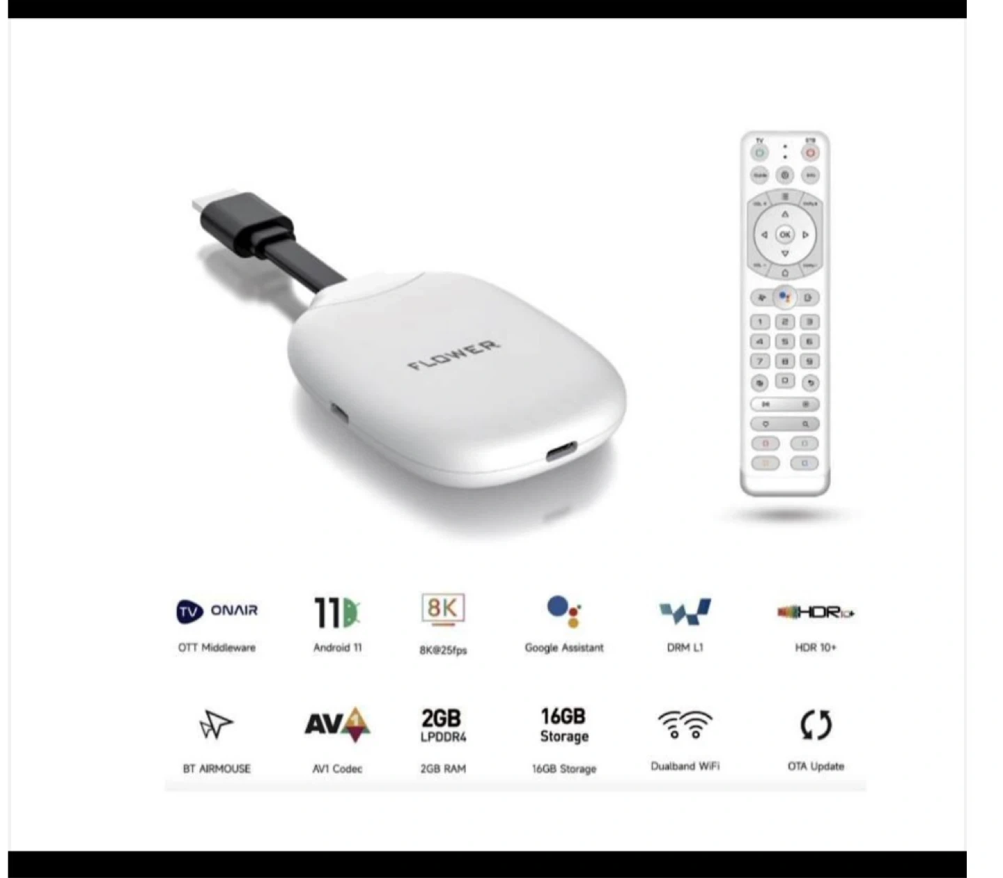 This is a Flower 8K Streaming Dongle and remote. It supports Android 11, Google Assistant, and 8K resolution. It comes with 2GB RAM and 16GB storage. Dual-band WiFi is included for connectivity.
