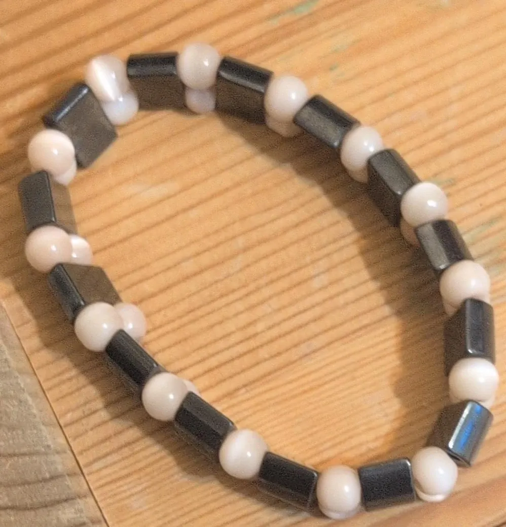 This bracelet features a stylish alternating pattern of dark rectangular beads and light round beads. It's an elasticated design for an easy fit. The combination of smooth and geometric shapes makes it a nice accessory.