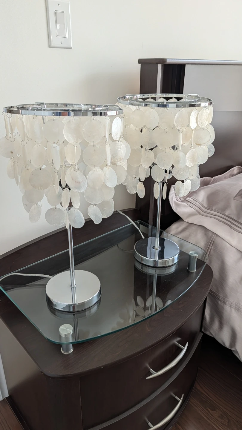 This pair of table lamps features a modern chrome base and a shade made of numerous white capiz shells. They're perfect for adding a soft, ambient glow to a bedroom or living space. The shell construction diffuses light beautifully.