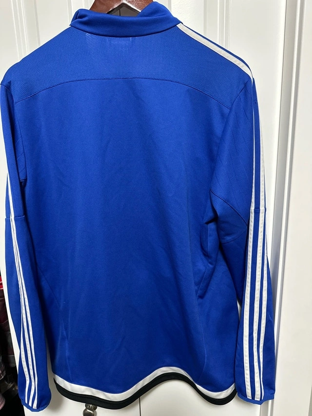Blue Adidas track jacket with white stripes. Features the ClimaCool technology for breathability. Zippered front and pockets. Condition: New. Size: Medium. For Sale By: Owner. Curbside pick up: Yes. Cash accepted: Yes.