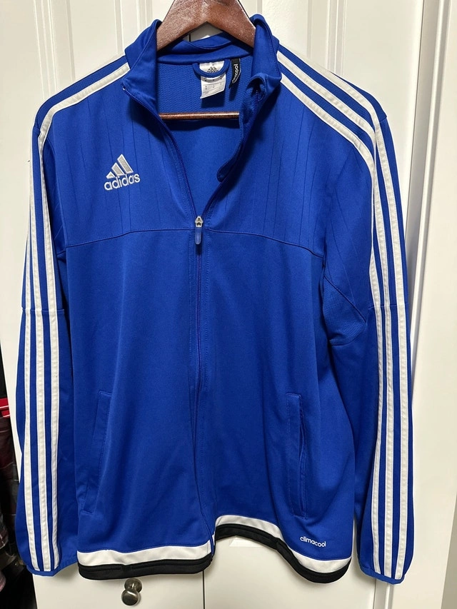 Blue Adidas track jacket with white stripes. Features the ClimaCool technology for breathability. Zippered front and pockets. Condition: New. Size: Medium. For Sale By: Owner. Curbside pick up: Yes. Cash accepted: Yes.