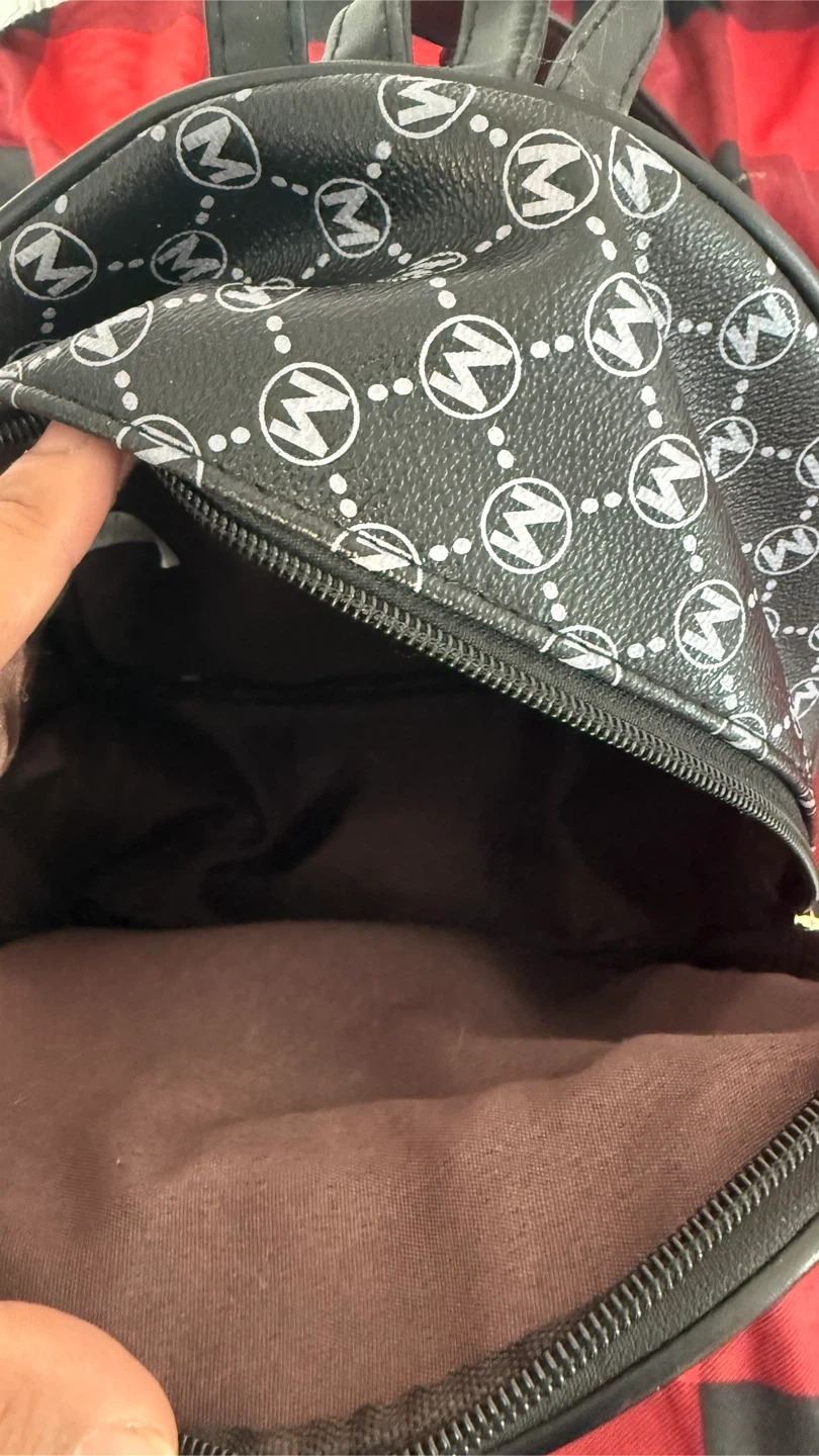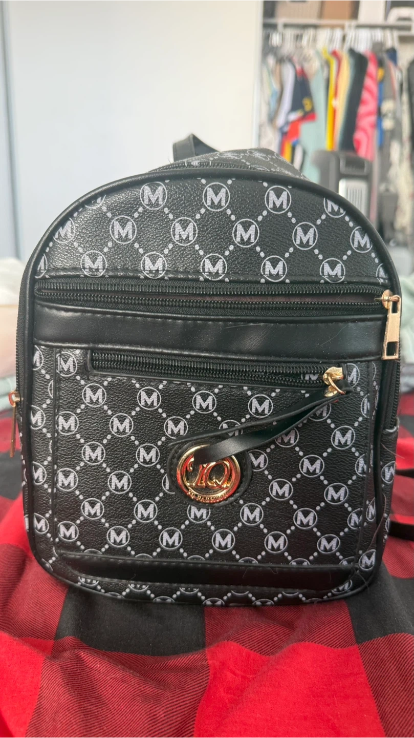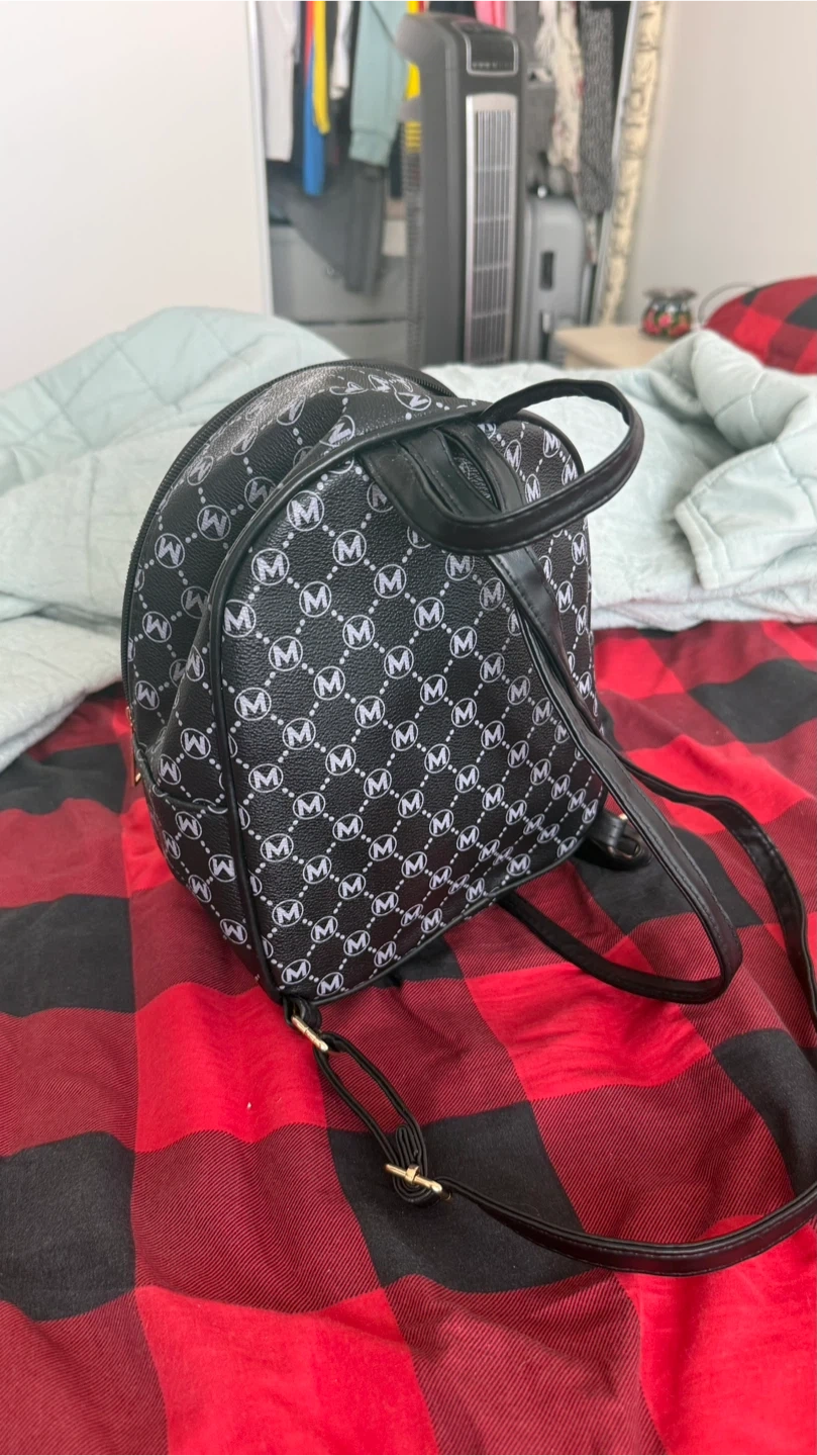 Cute mini backpack with an all-over 'M' pattern! It's black with silver/white accents and gold-tone hardware. Perfect for carrying your essentials in style