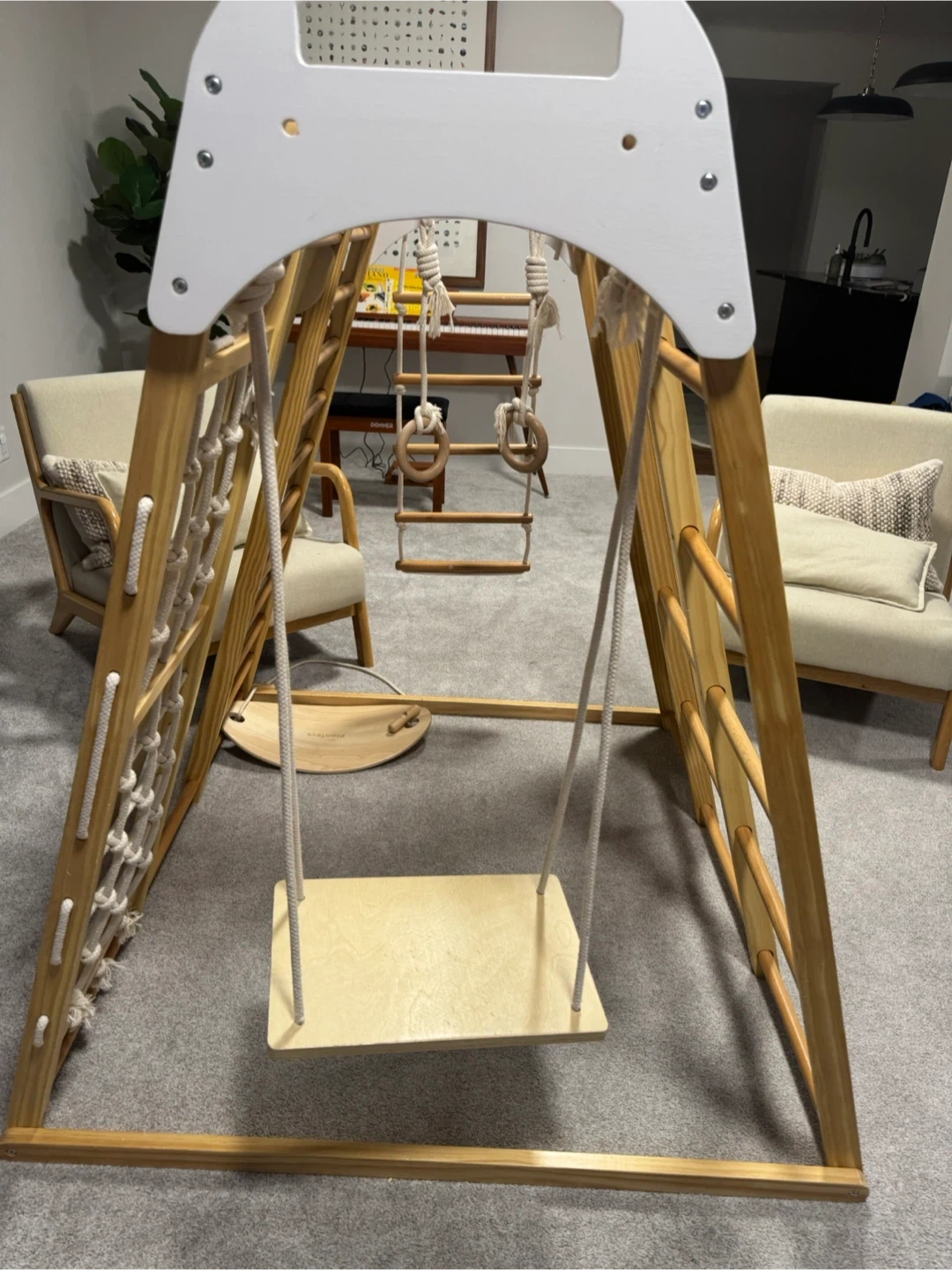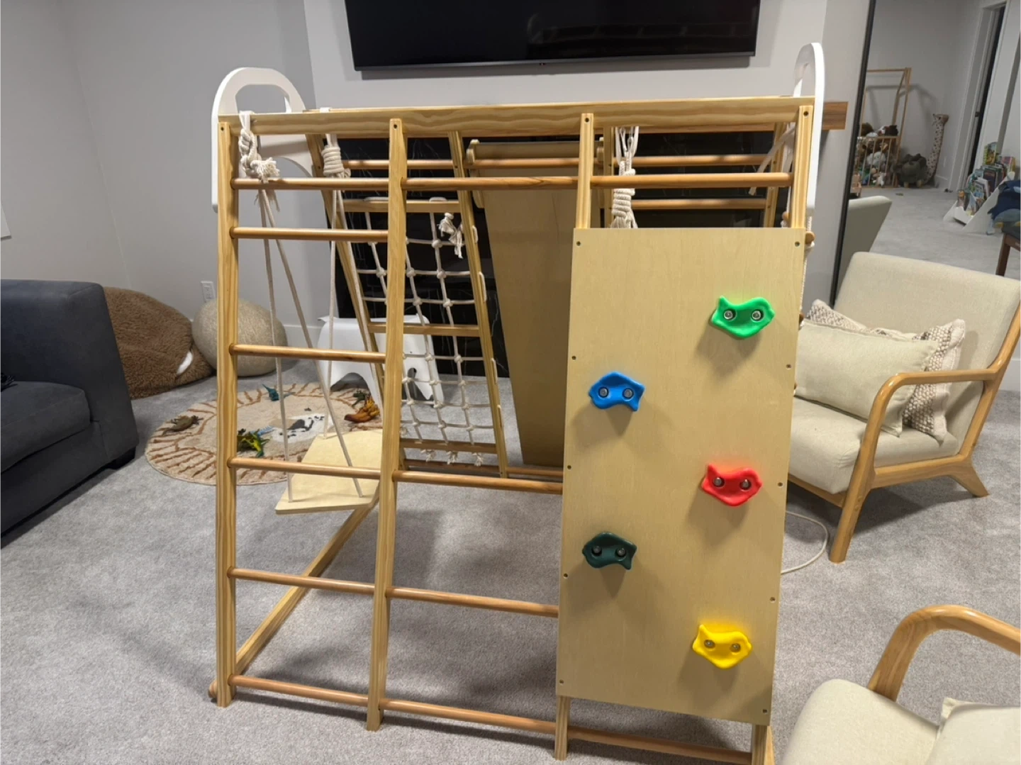 A versatile wooden indoor jungle gym set. It features a climbing wall with colourful holds, a rope net, a swing, and monkey bars. Great for active play indoors!