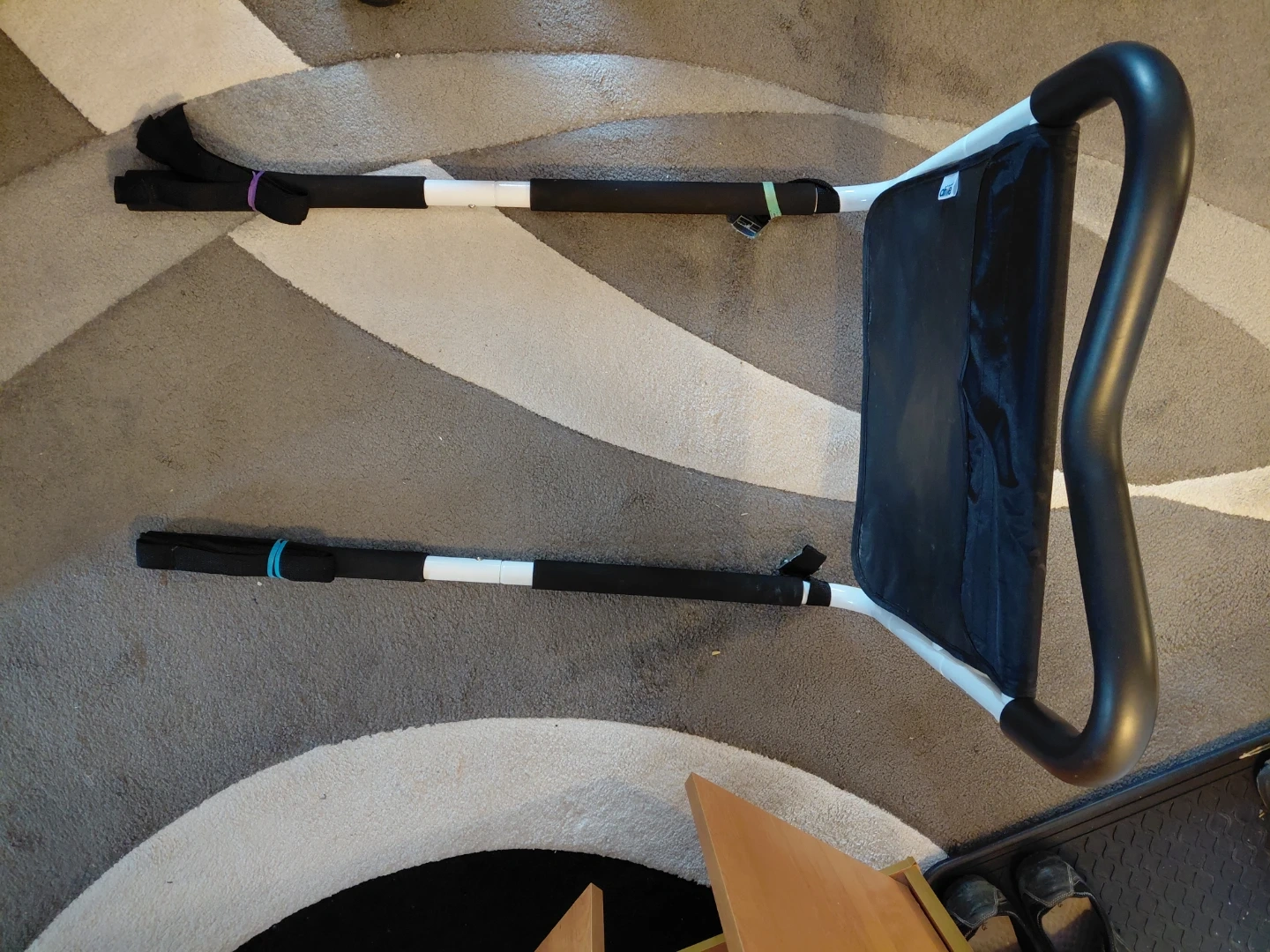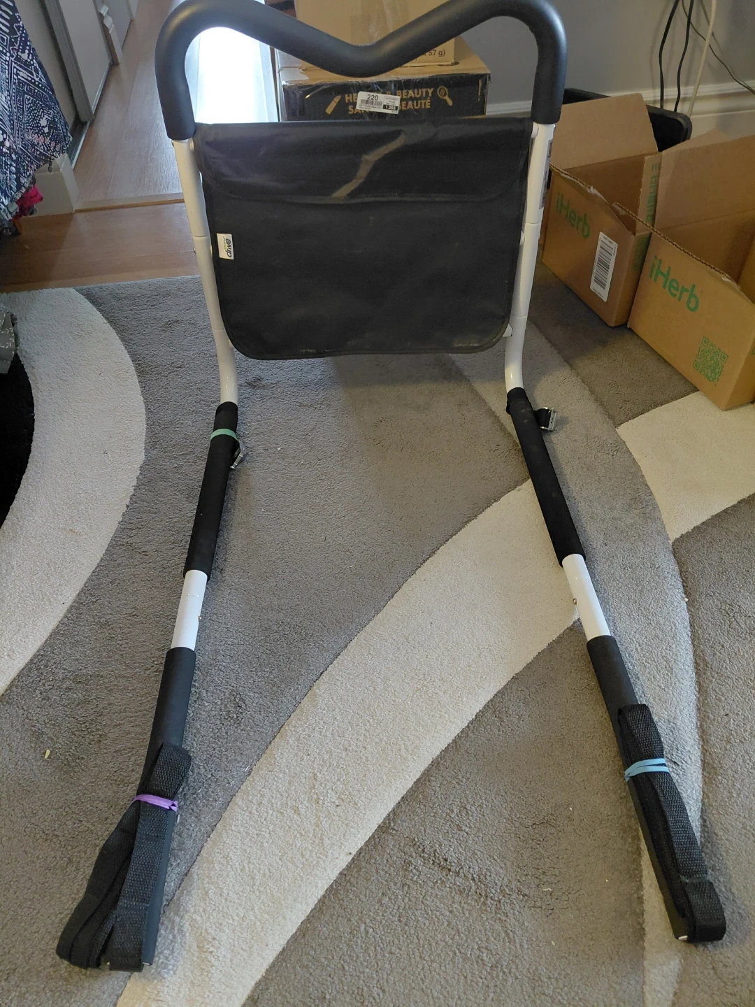 This bedside assist bar helps you get in and out of bed easier. It's made with a sturdy metal frame and a black fabric pouch. Includes straps for securing to the mattress. CASH ONLY. PICK UP ONLY.