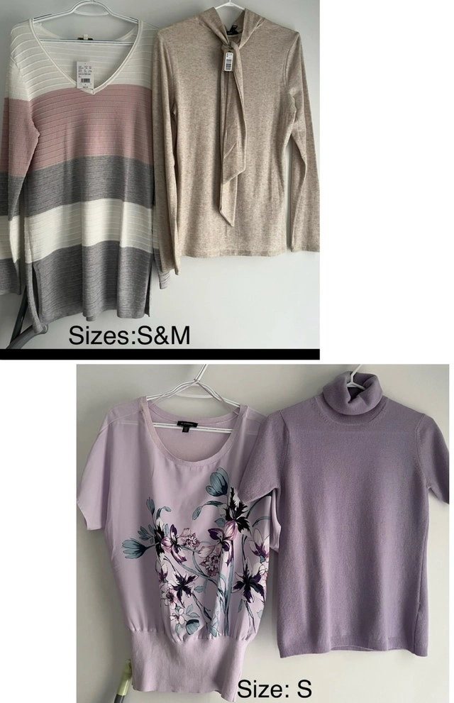 -The collection includes a variety of blouses, sweaters, tops, dresses, jackets, coats, and shoes, perfect for creating versatile and polished looks. Various styles and colors. Sizes range from XS-M (most are S and M). Perfect for layering or wearing alone.