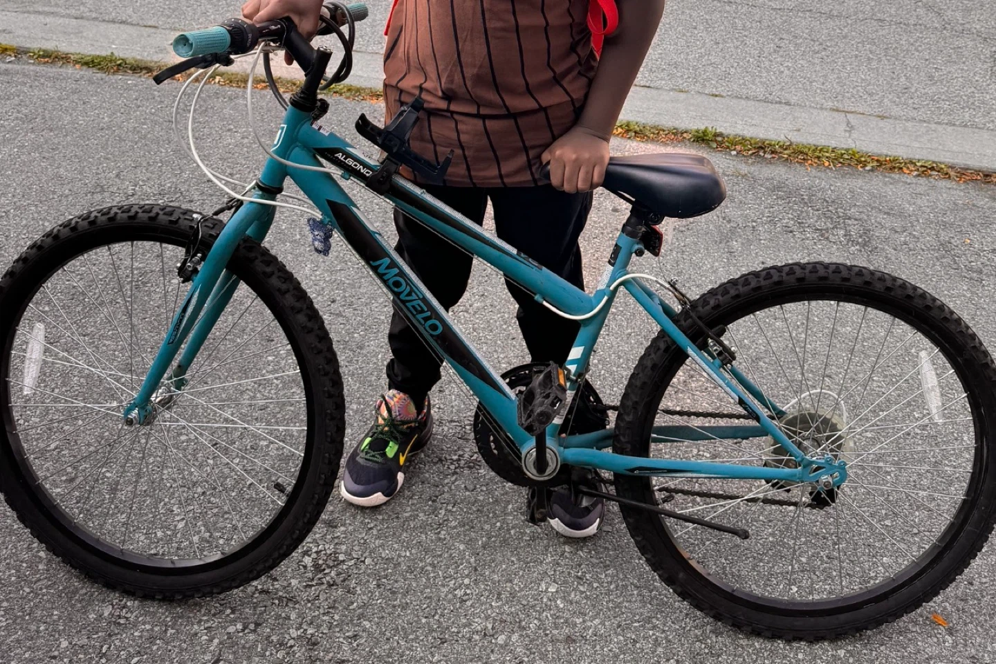 This is a Movelo mountain bike in teal. It's a sturdy bike with thick tires, perfect for trails. The bike comes with a water bottle cage attached to the frame. Scratches on the seat. Boys bike for 8-10 year old. Pick up only.