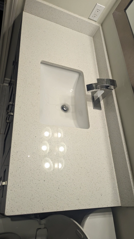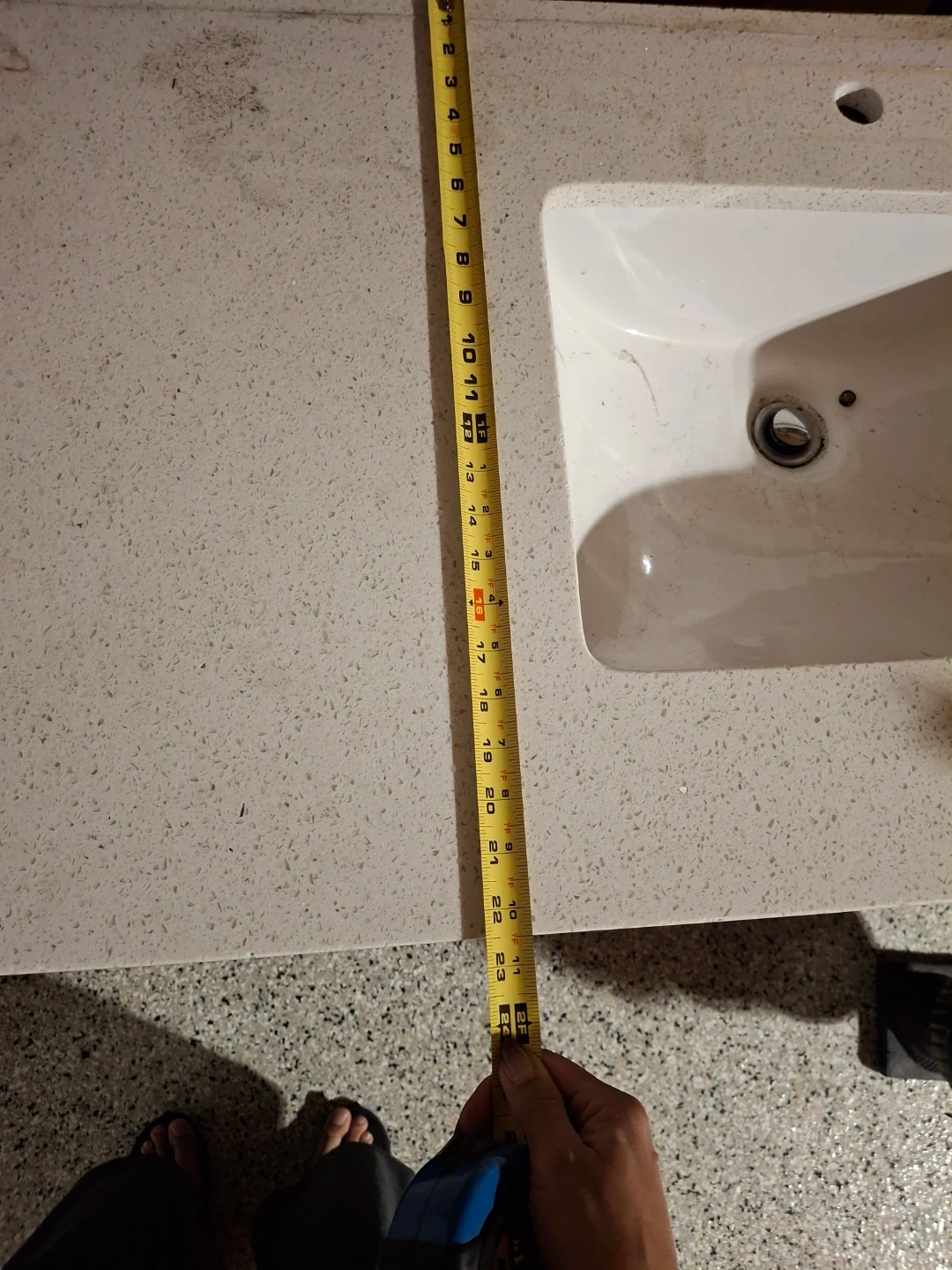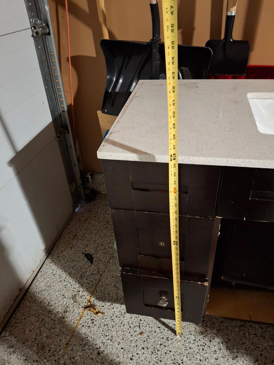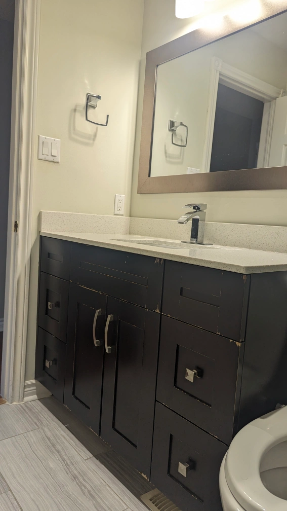 Selling a bathroom vanity with a sink and shaker cabinetry. It has a brown finish and a light-coloured countertop. The vanity includes 4 soft close drawers and cabinet space for storage. Please note that the doors are currently detached but are included. as well as hardware and back splash.