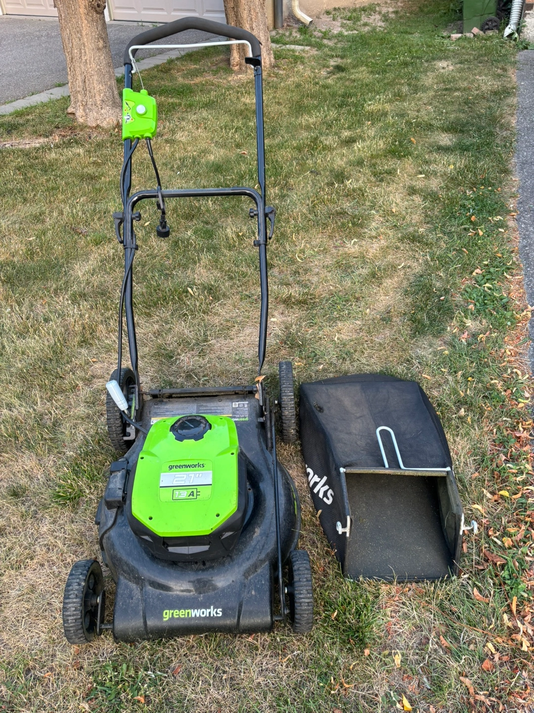 Selling a Greenworks 21-inch cordless lawn mower. It comes with the collection bag. Please note that the collection bag has a hole in it. Otherwise, the mower is in good working condition!