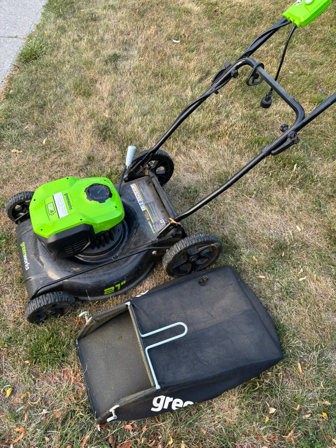 Selling a Greenworks 21-inch cordless lawn mower. It comes with the collection bag. Please note that the collection bag has a hole in it. Otherwise, the mower is in good working condition!