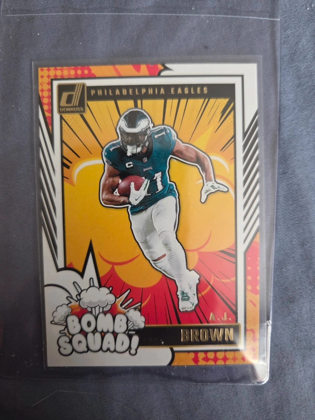 This is a 2023 Donruss football card featuring A.J. Brown of the Philadelphia Eagles. It highlights the "Bomb Squad!" theme. Card is in protective sleeve.