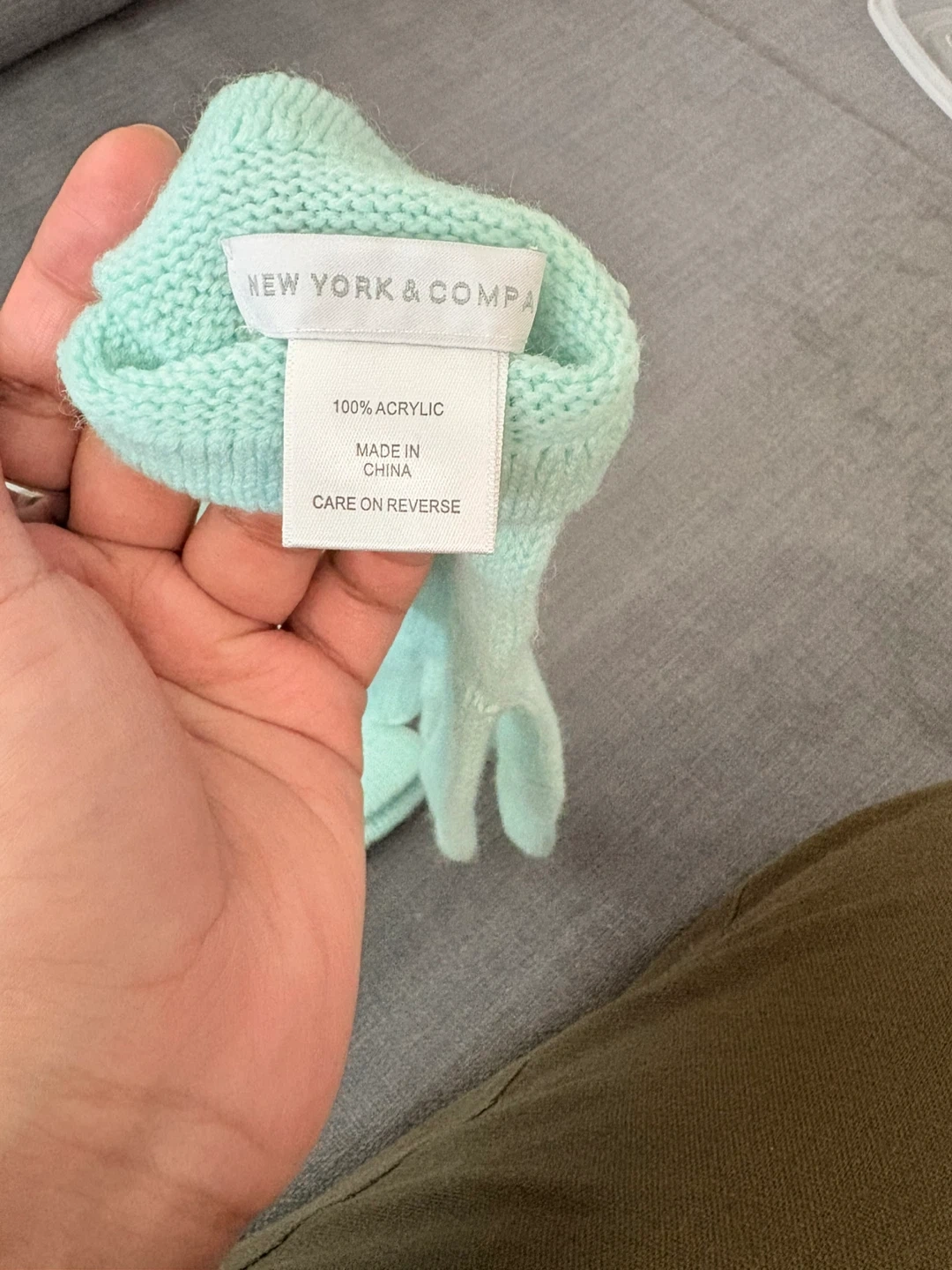 Keep your hands cozy with these gloves from New York & Company! They are made of 100% acrylic and come in a lovely light blue colour