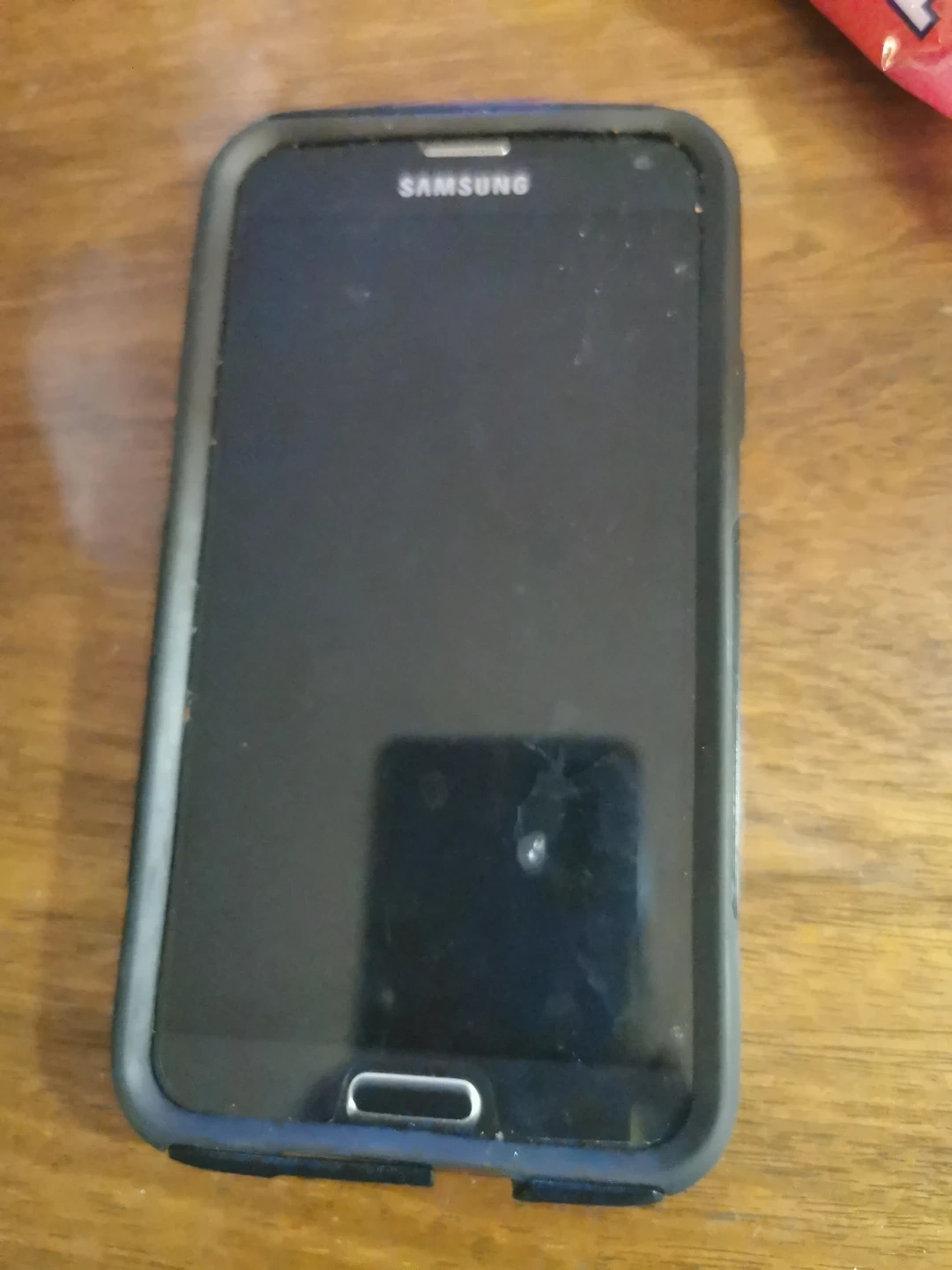 Samsung smartphone in a black Otterbox case. This phone has a durable Otterbox protective casing. It's a black smartphone. no charger