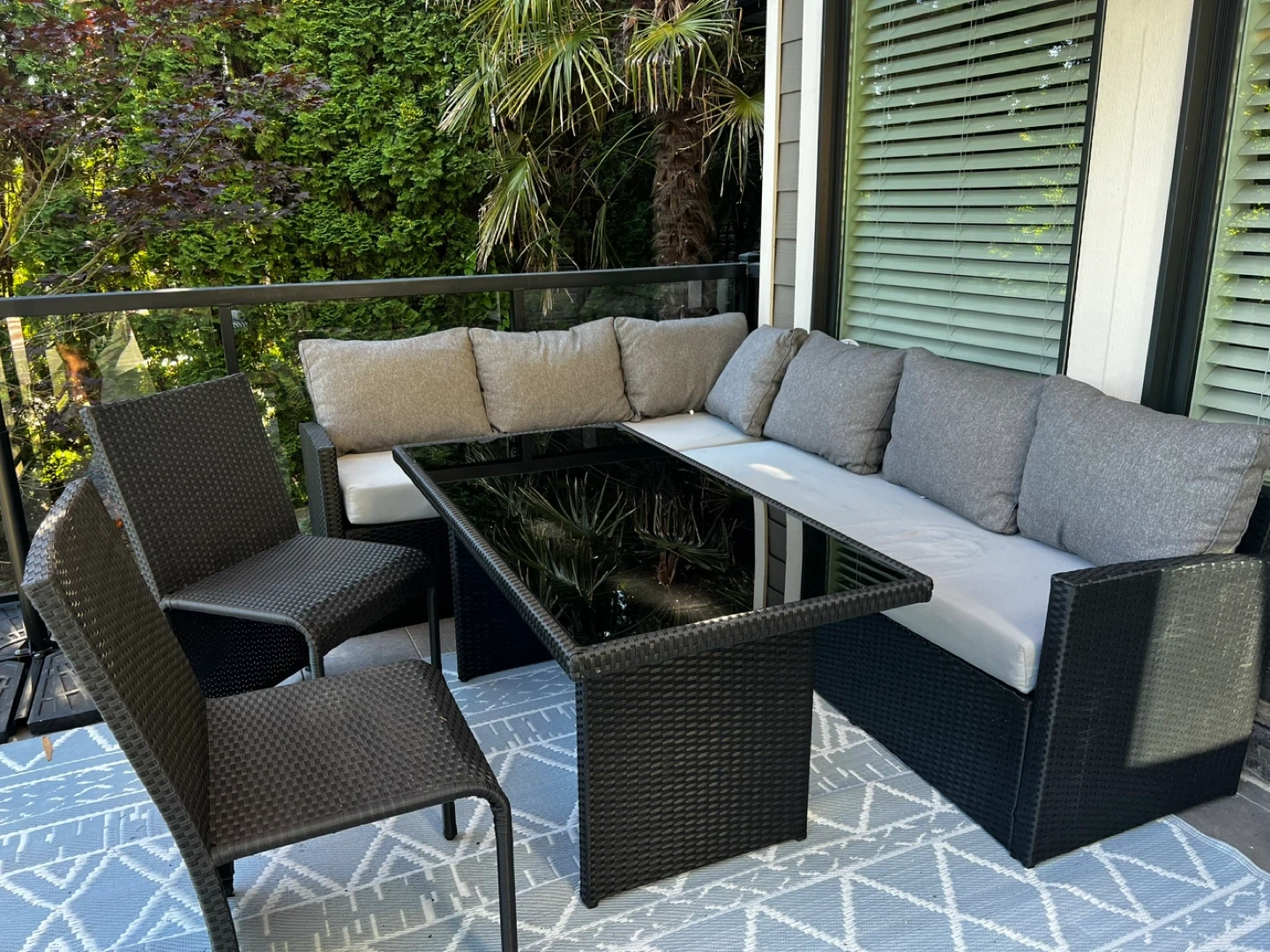 This outdoor wicker patio sofa is 2 pieces for an L shaped couch. It's made with durable wicker and comes with grey cushions. This set is perfect for enjoying your backyard or balcony! Each piece is 66” L x 26” D x 28” H, the arm rest is 22” & seat height is 14” before cushions 18” with cushion