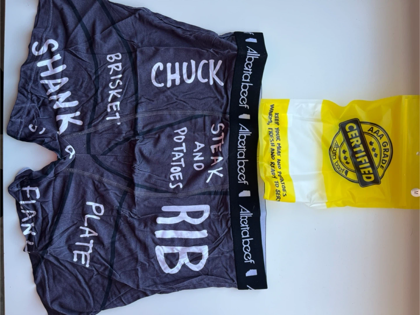 These fun boxer briefs feature a dark grey base with a print of various beef cuts and "Steak and Potatoes". The waistband is black with the "Alberta Beef" logo. It's a size medium.