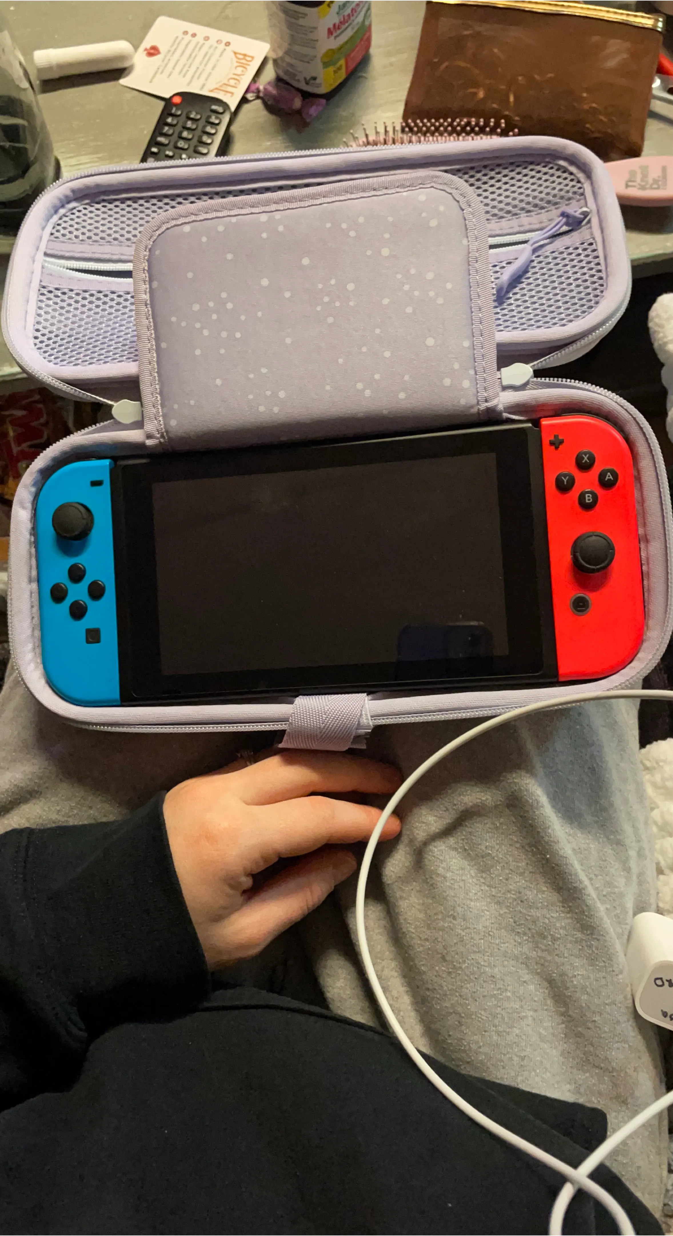 Comes with blue and red Joy-Con controllers. This gaming console is in a protective purple case with a speckled design. Perfect for on-the-go gaming!