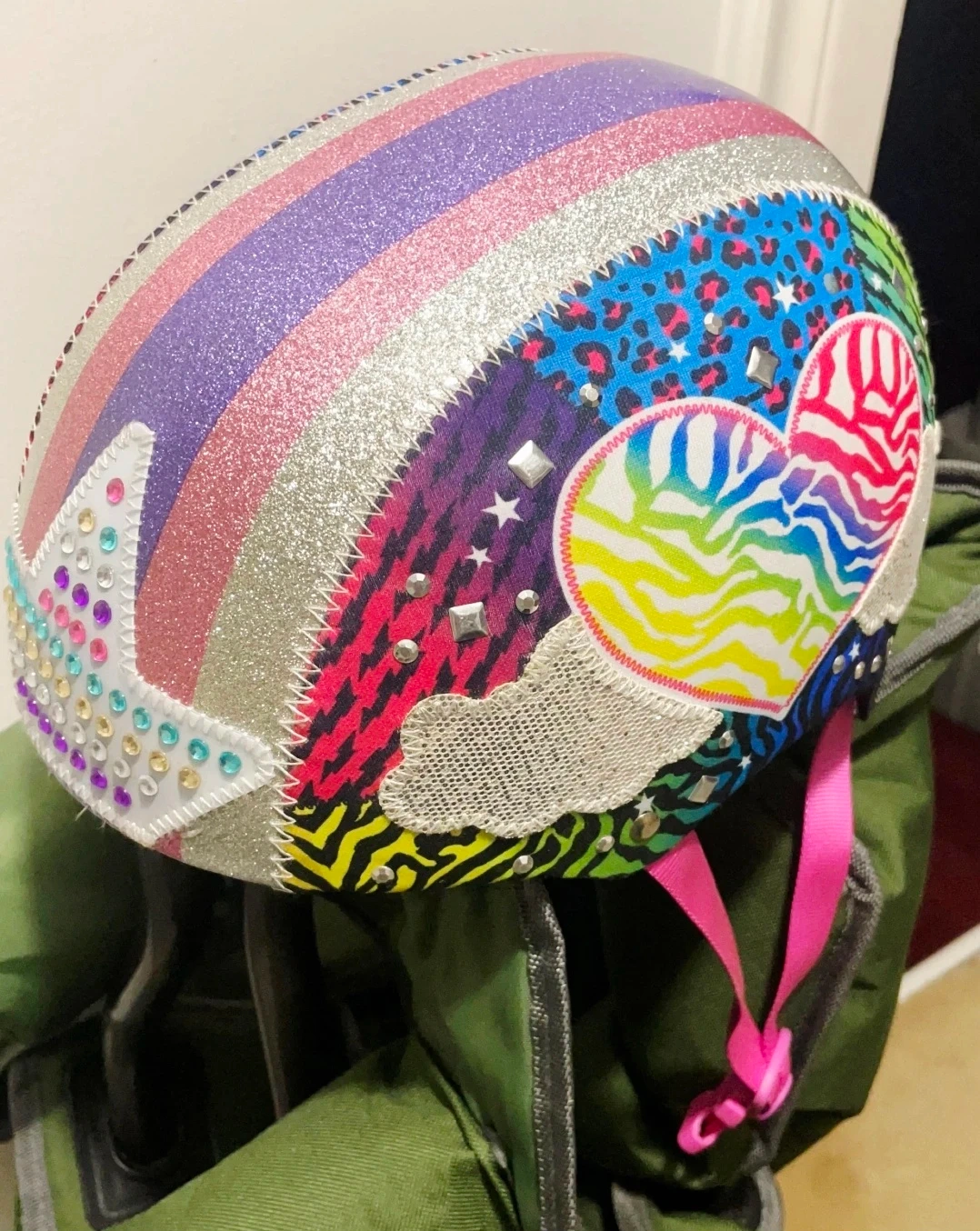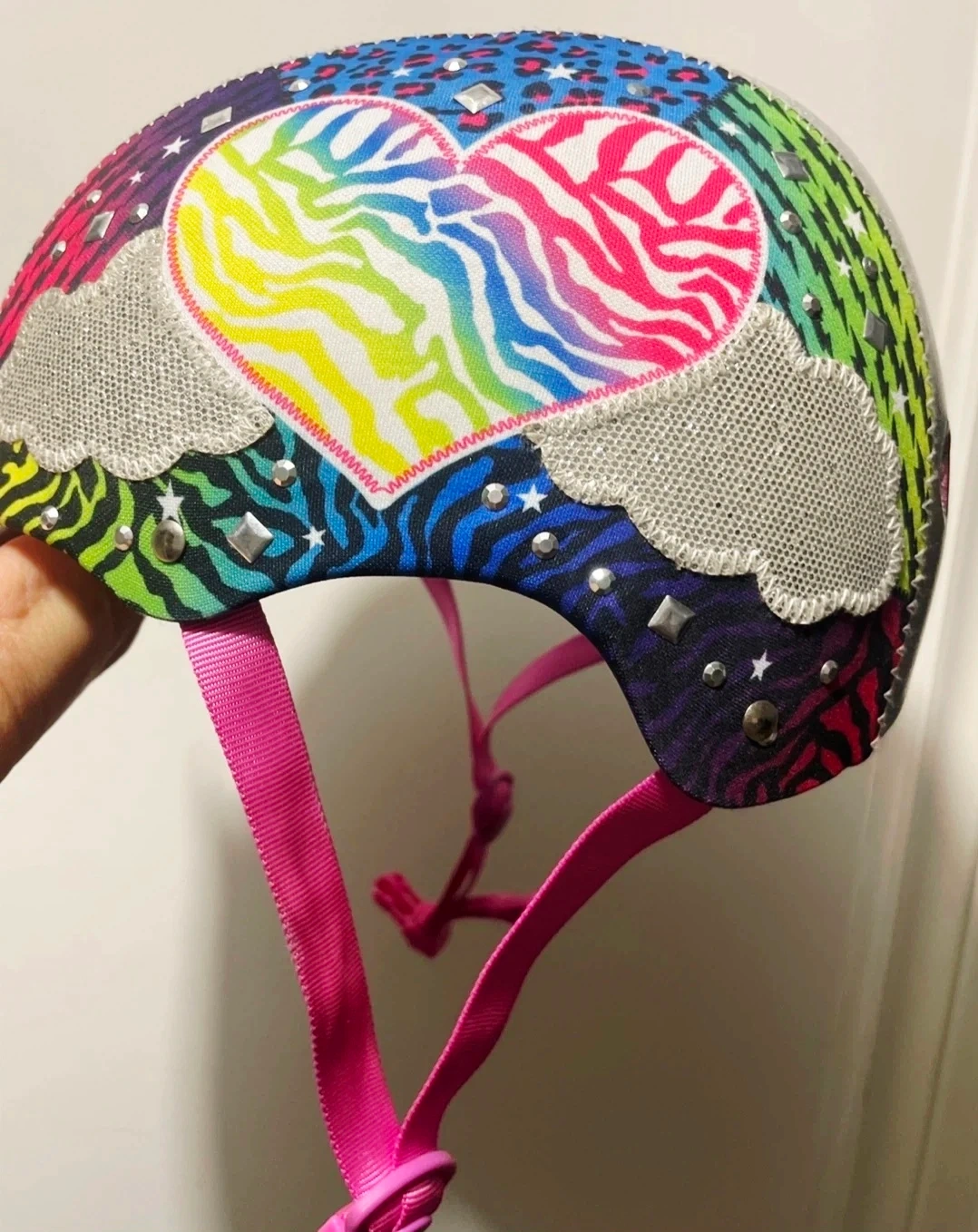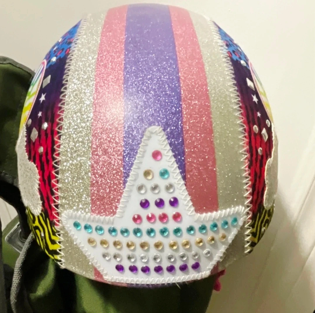 This colourful bike helmet is decorated with glitter, studs, and rainbow patterns. It's a size small with adjustable straps and pink chin padding. Ideal for cycling or scooting!