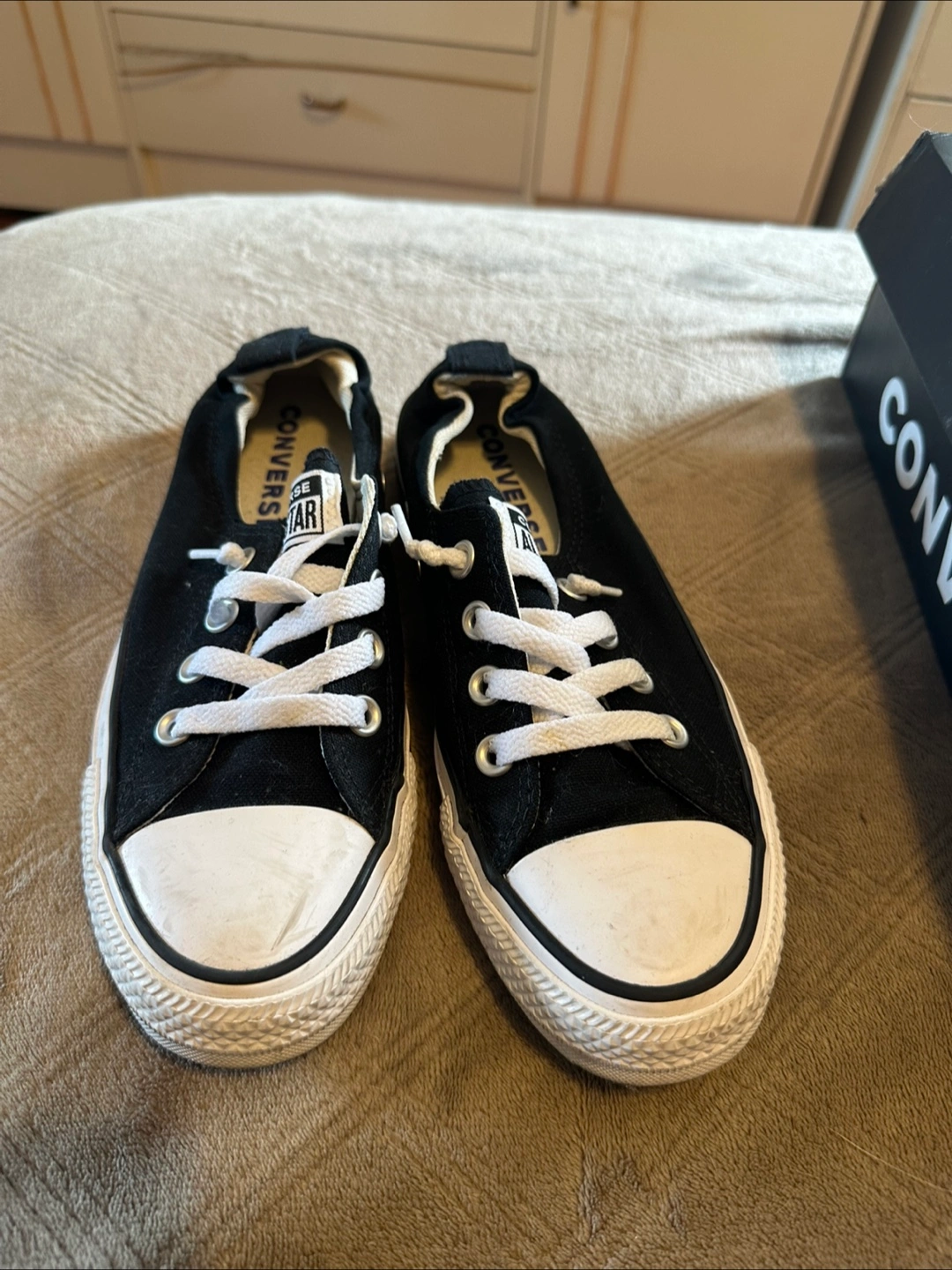 Black Converse sneakers with white soles and laces. The shoes are lace-up and slip-on. They come with a shoe box. You can wear them for a nice walk in the park.