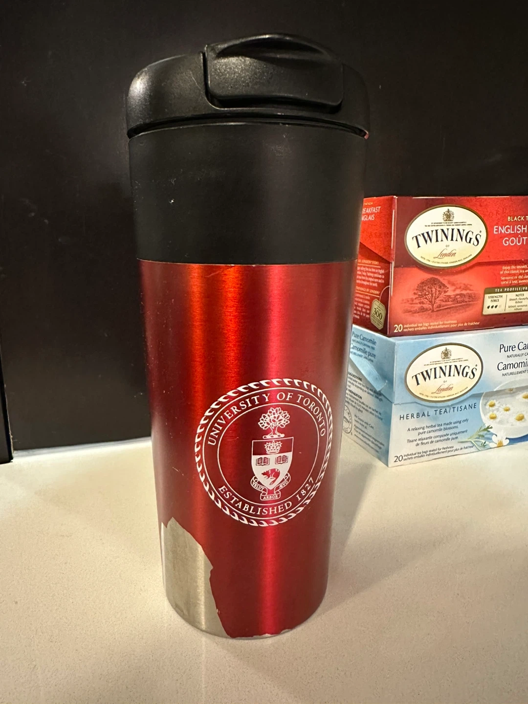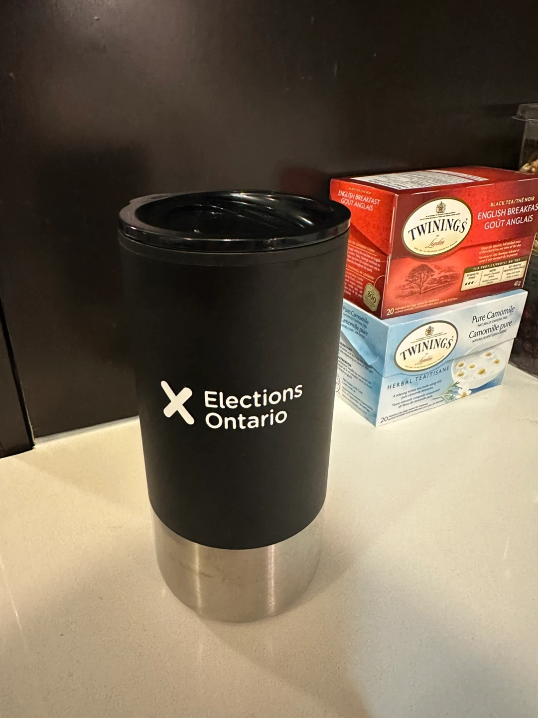 Black and silver travel mug with Elections Ontario logo for 20 cad.