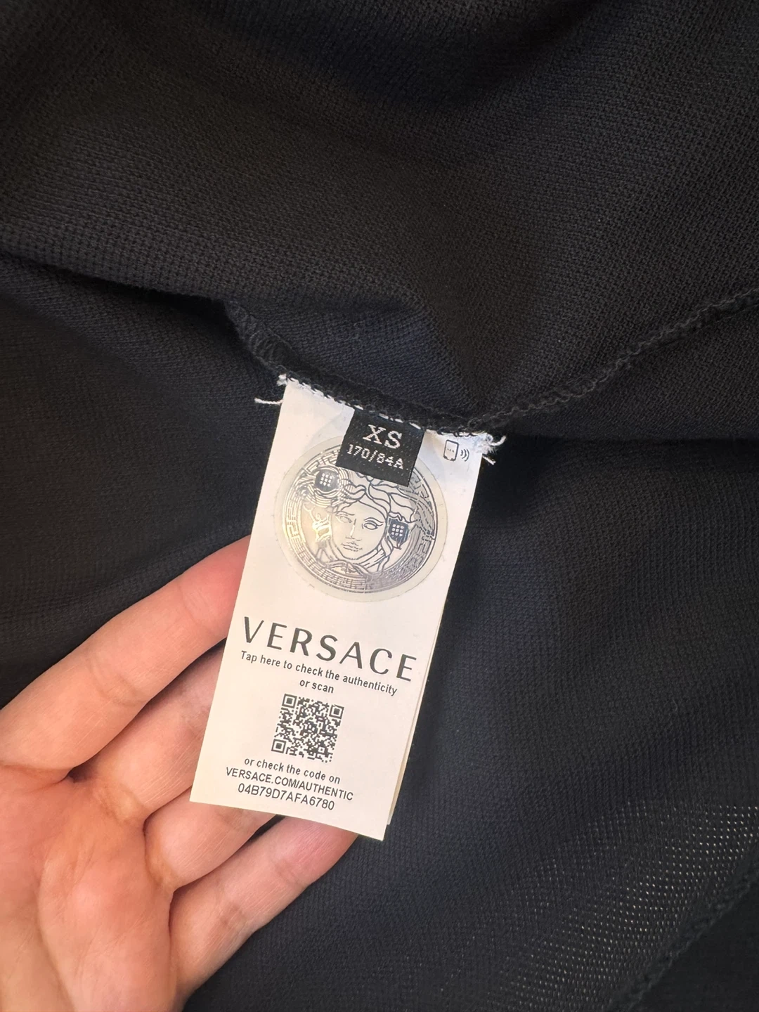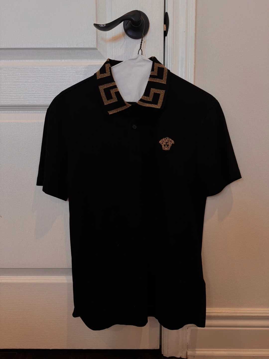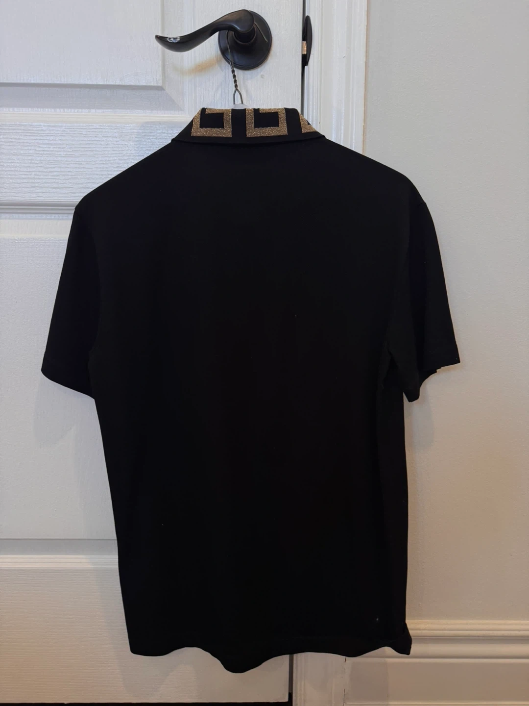 A black Versace polo shirt with Greek key detail on the collar. Size XS