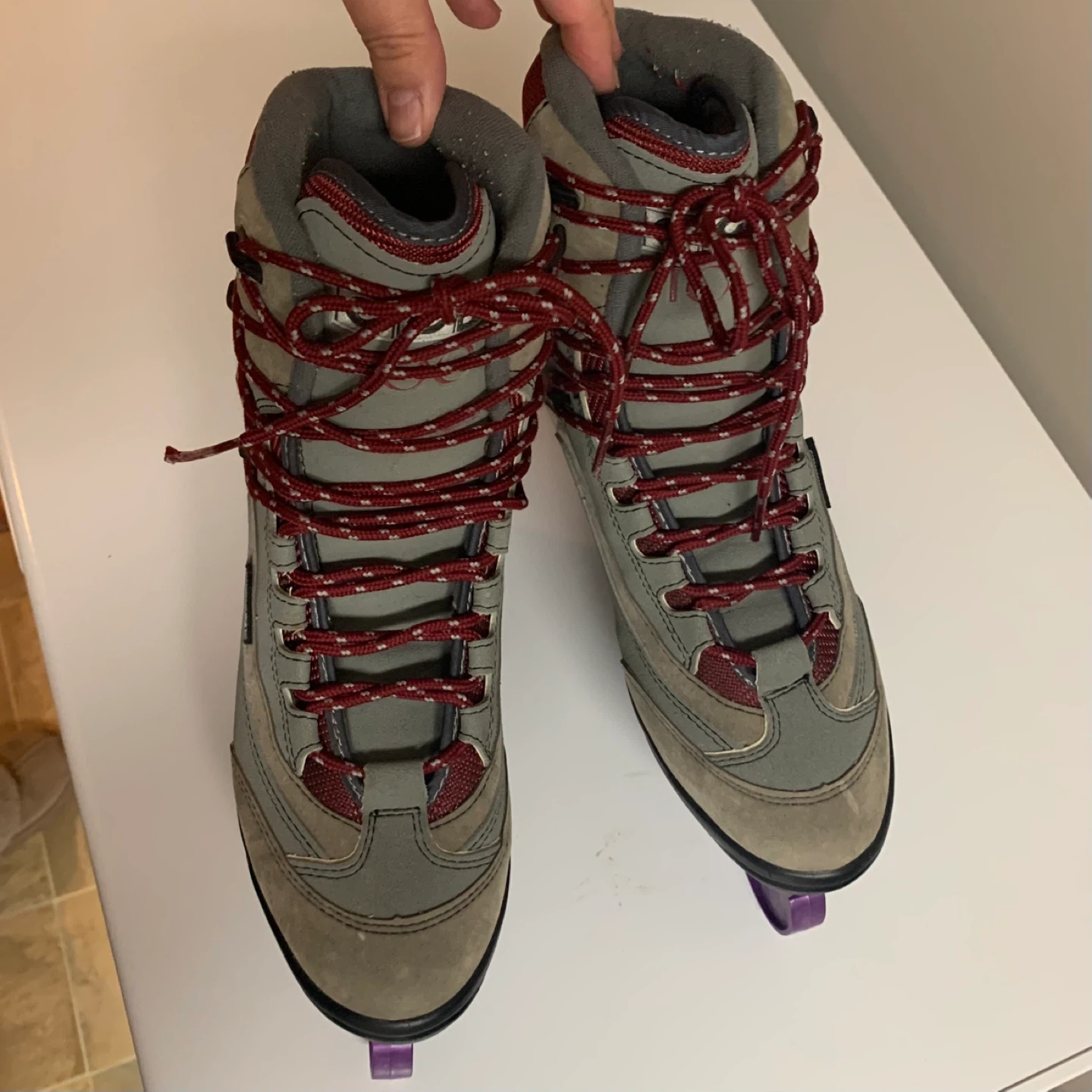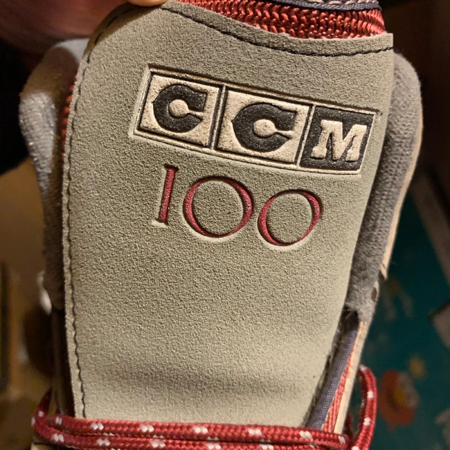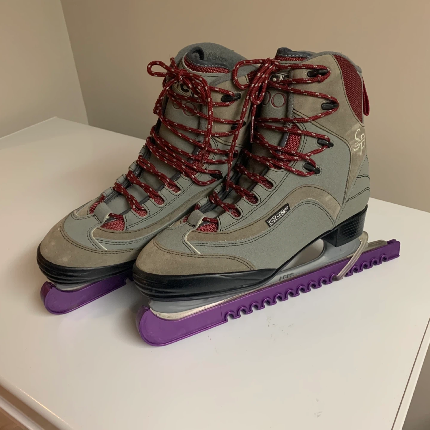 CCM 100 figure skates. Suede and synthetic material construction. Red laces with grey and burgundy accents. Comes with purple blade guards. Excellent condition!