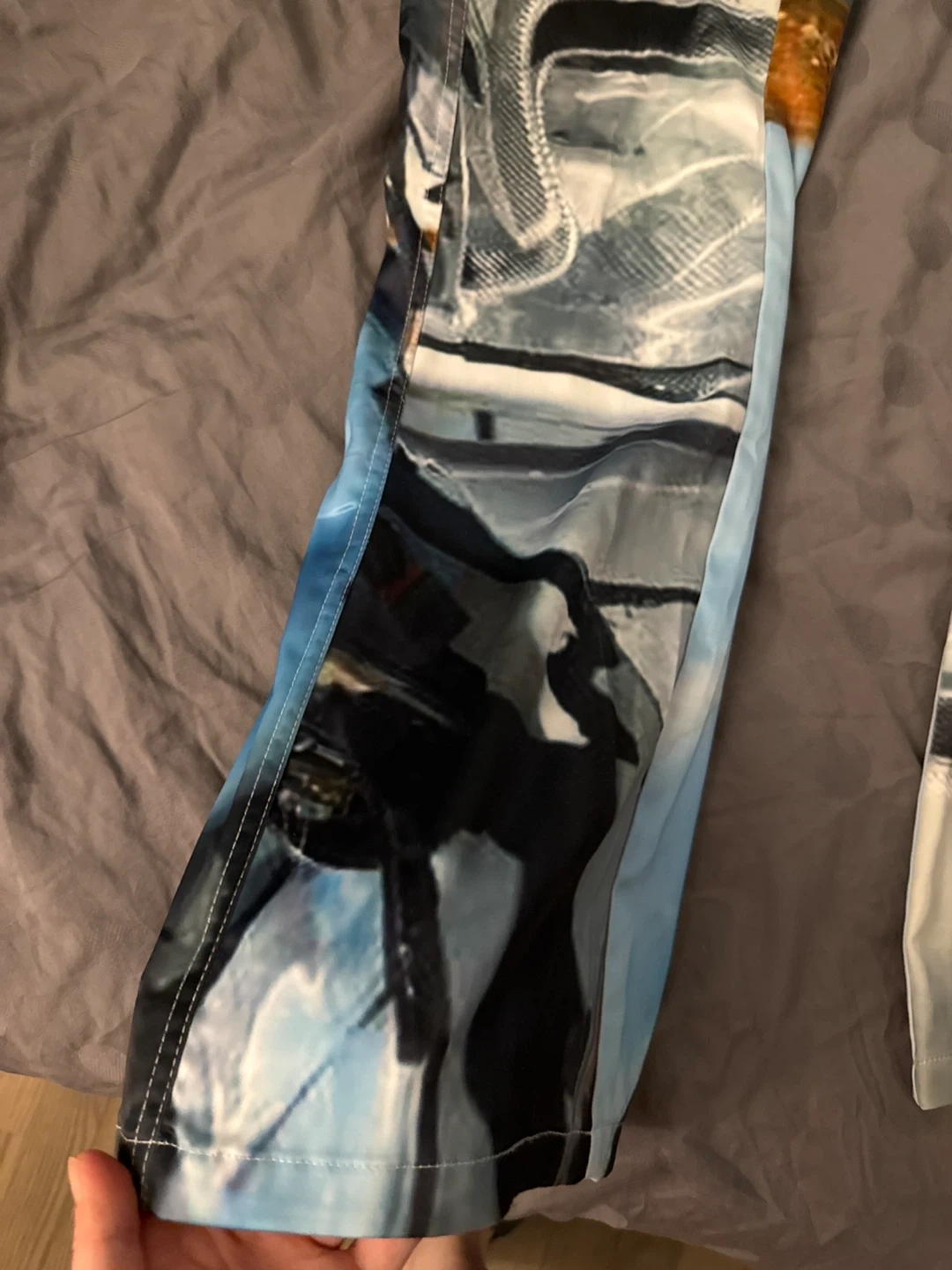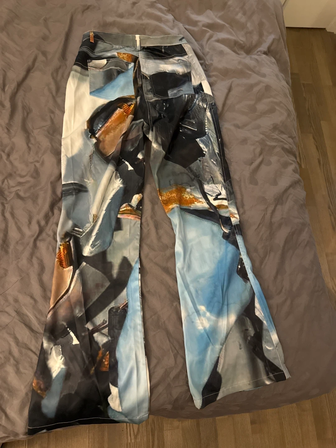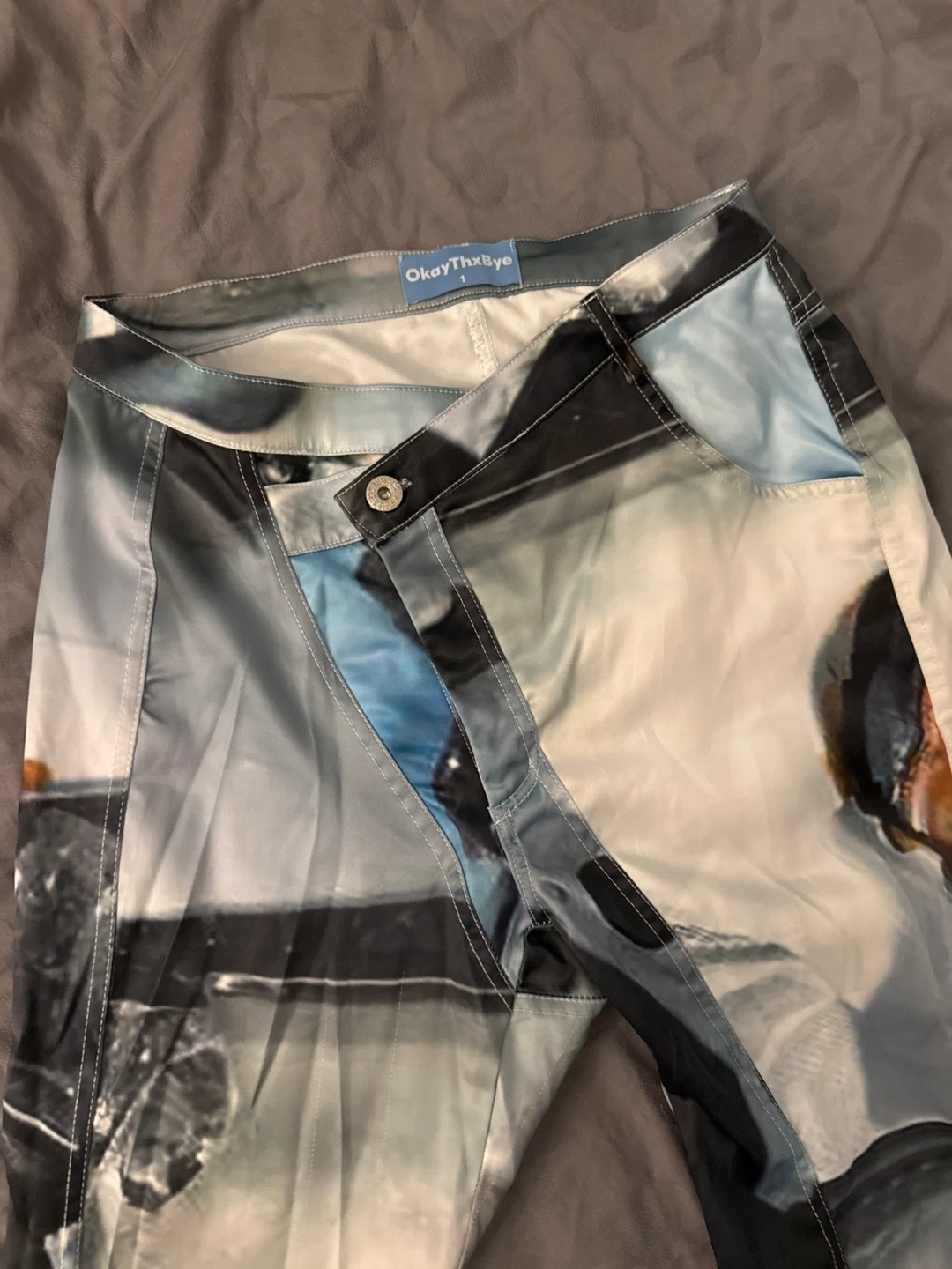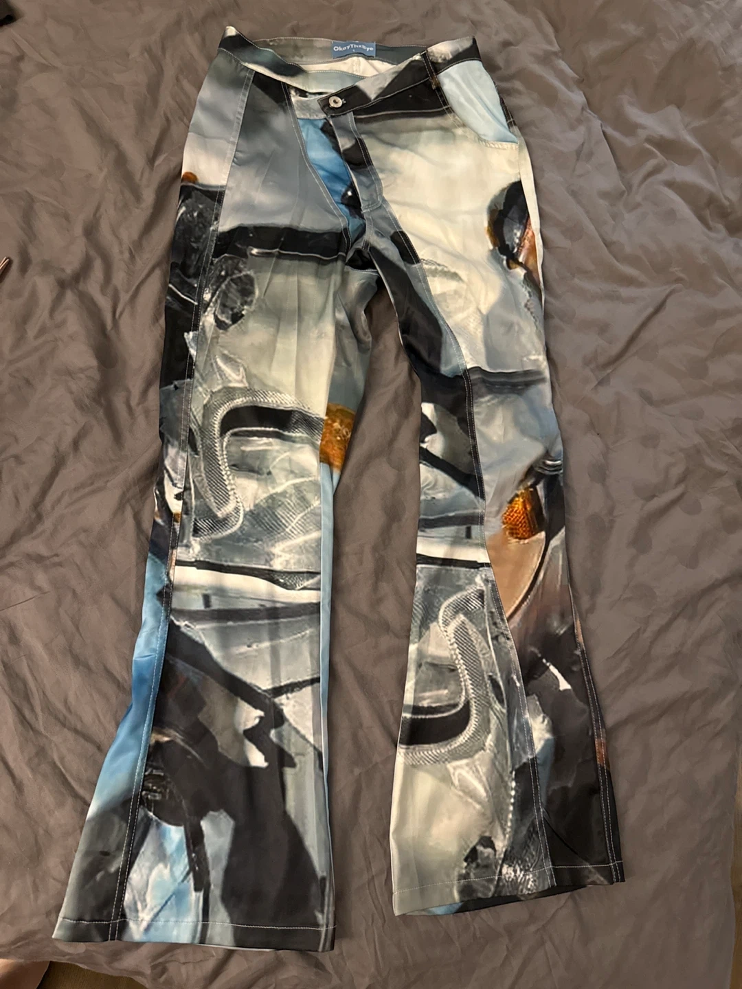 These unique OkayThxBye flare pants feature a bold, abstract graphic print. They're made with a lightweight fabric and have a comfortable fit. Perfect for adding a statement piece to your wardrobe!