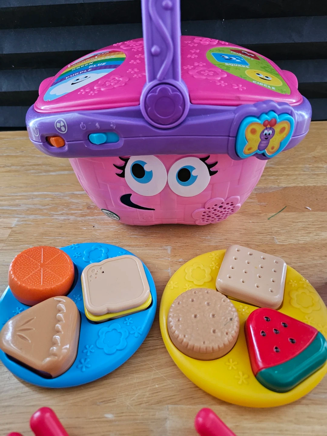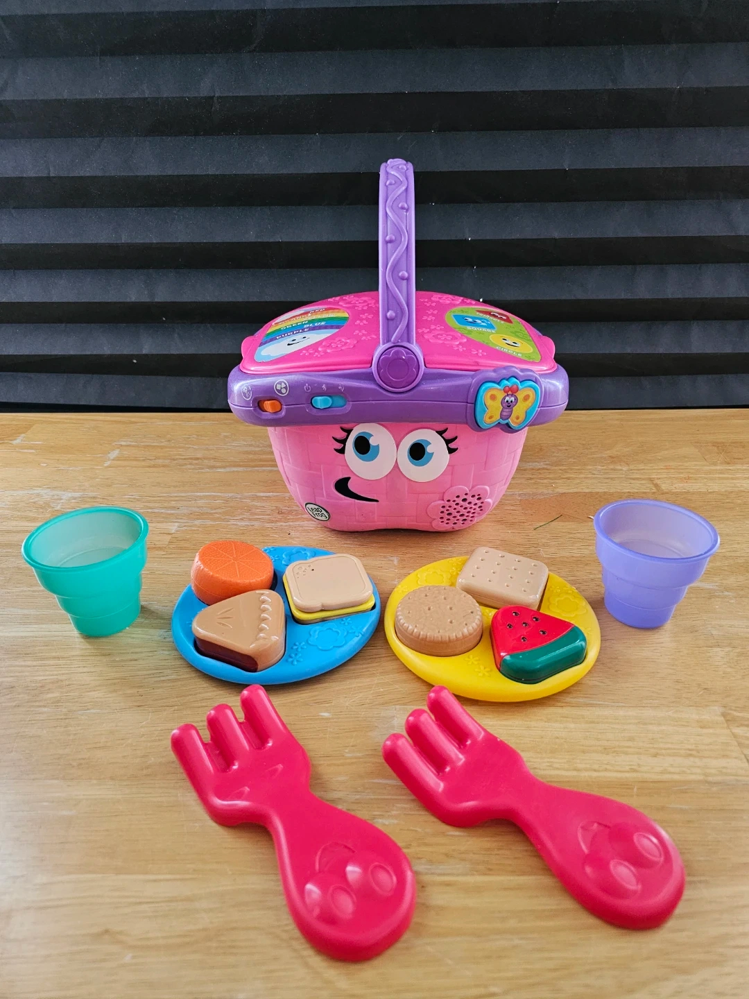 This LeapFrog basket teaches first words and includes fun music! It comes with food pieces like oranges, sandwiches, crackers, and watermelon. Also includes two cups and two forks for pretend play. Perfect for little ones learning to talk!
