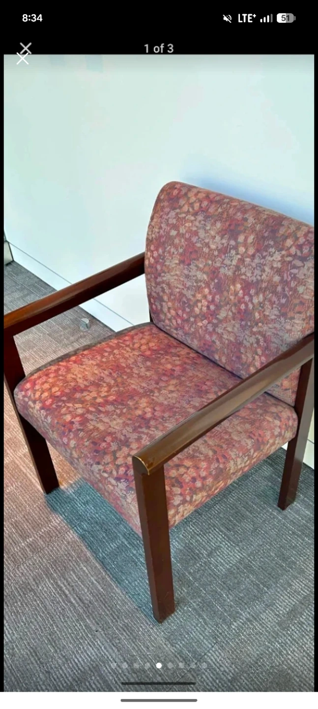 Armchair with a wooden frame and patterned fabric upholstery. It has a comfortable seat and backrest. Suitable for waiting areas or offices.