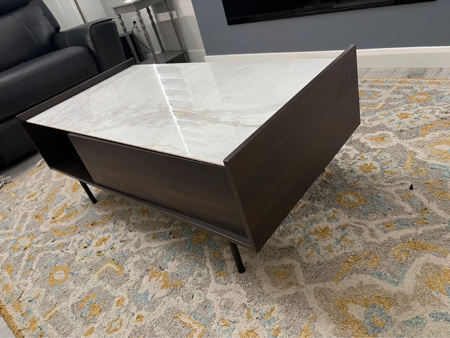 This modern coffee table has a stylish marble-look top and a dark wood-finished body. It features an open side compartment for storage. A great addition to your living space!