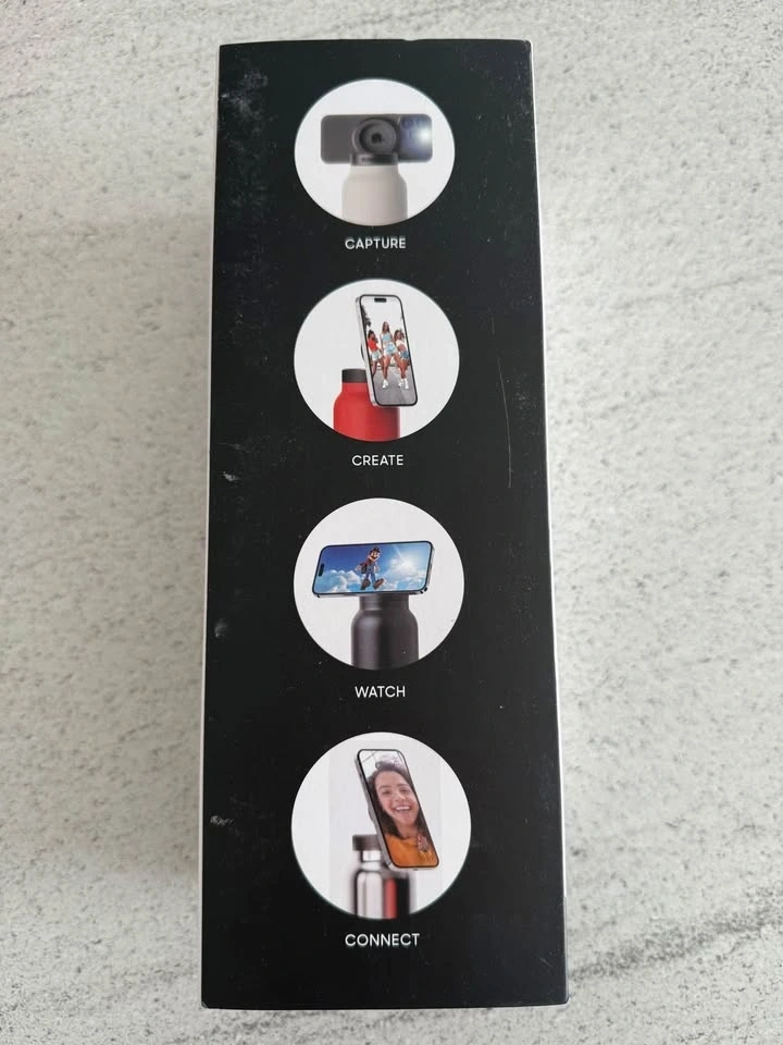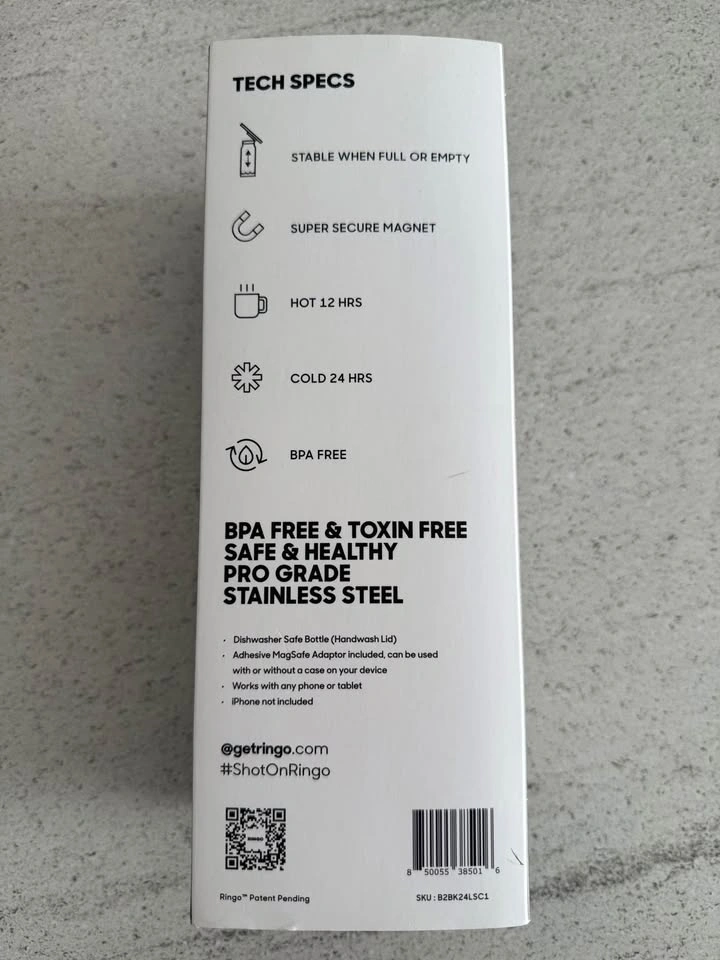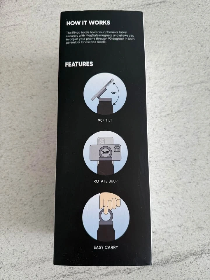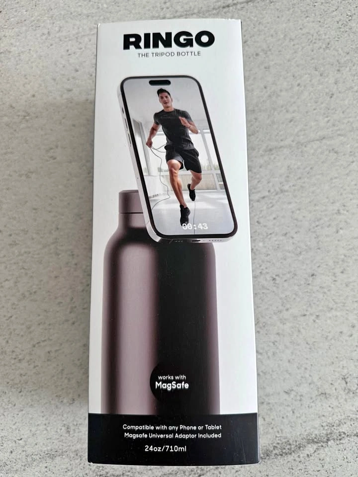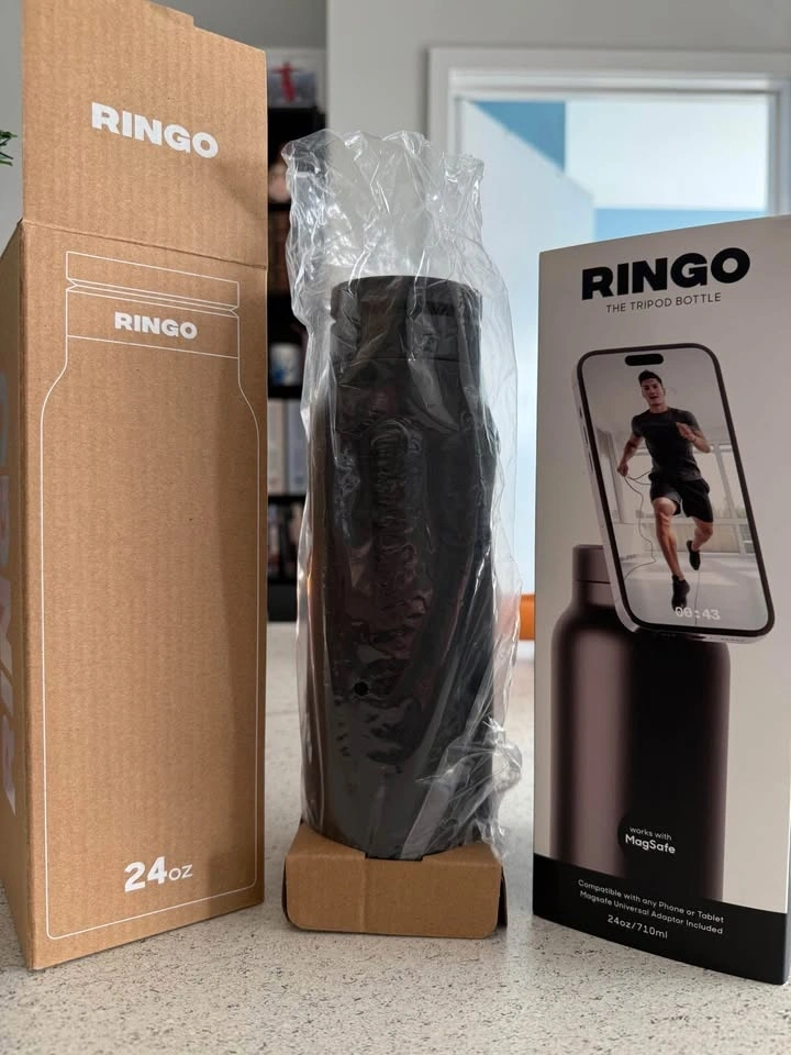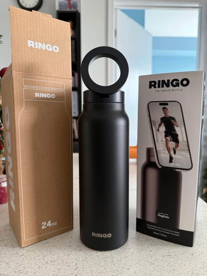 Brand new, never used. The 24 oz. water bottle that magnetically holds your phone. Whether you're shooting your next movie, your next piece of viral content, or capturing your process at the gym - Ringo helps you get the perfect shot. Snap on your phone, and it's ready to securely shoot at any angle. Compatible with all devices: iPhone 12 and above out of the box, as well as other devices with a Magnetic Booster Ring.