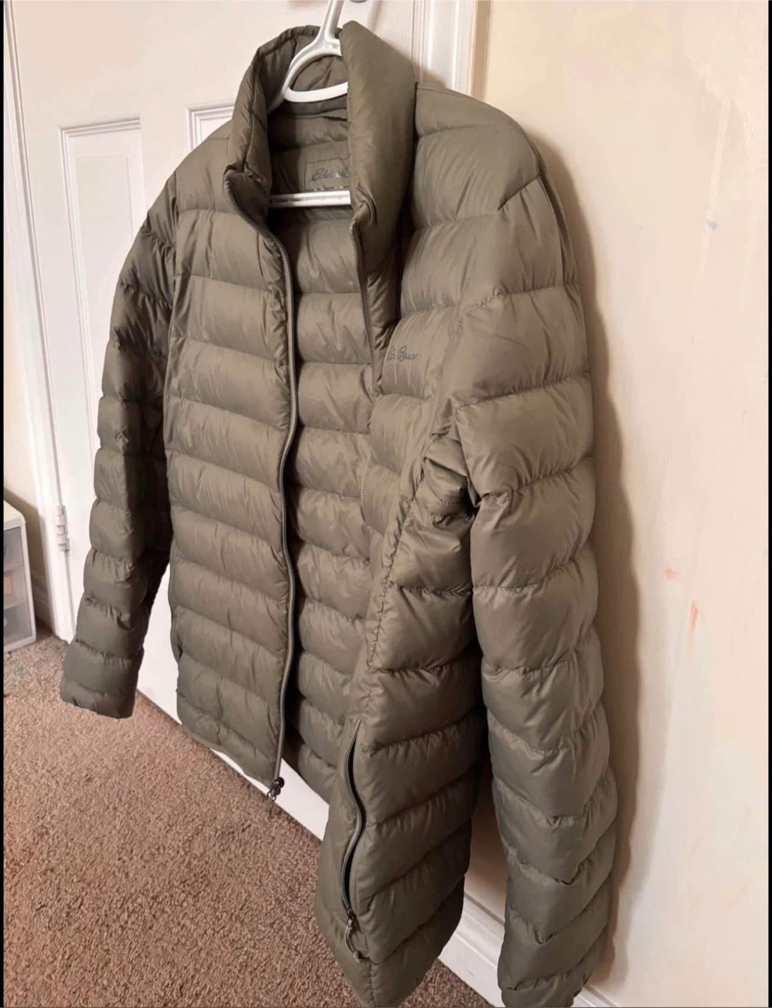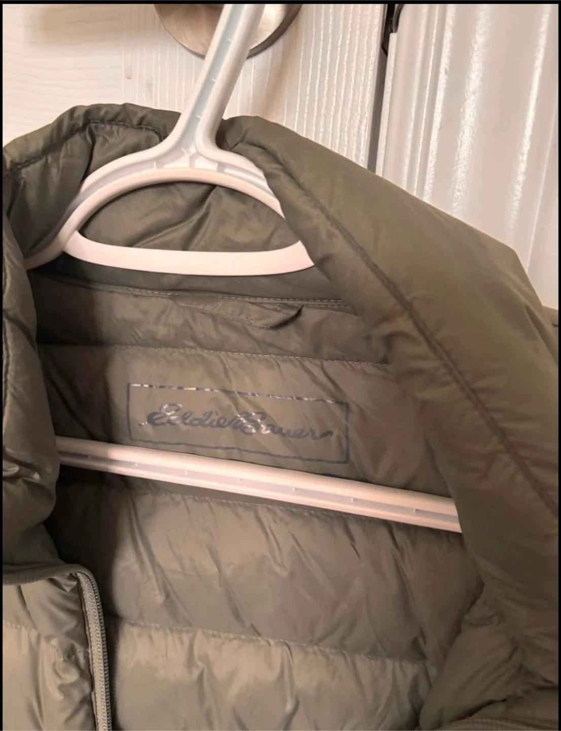 Eddie Bauer down puffer jacket size small in a nice olive green colour. It's perfect for staying warm The jacket is in great condition and ready for a new home! It's lightweight.