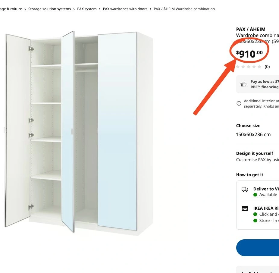 Full size IKEA PAX / ÅHEIM Wardrobe combination in brown-black/mirror glass. Appx size 5'Wide x 2'Deep x 7'8"High.