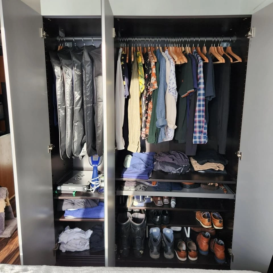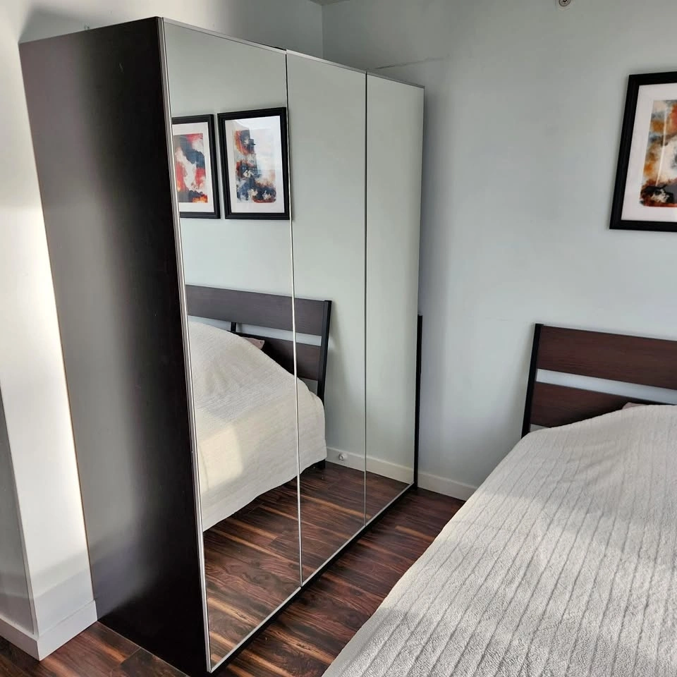 Full size IKEA PAX / ÅHEIM Wardrobe combination in brown-black/mirror glass. Appx size 5'Wide x 2'Deep x 7'8"High.