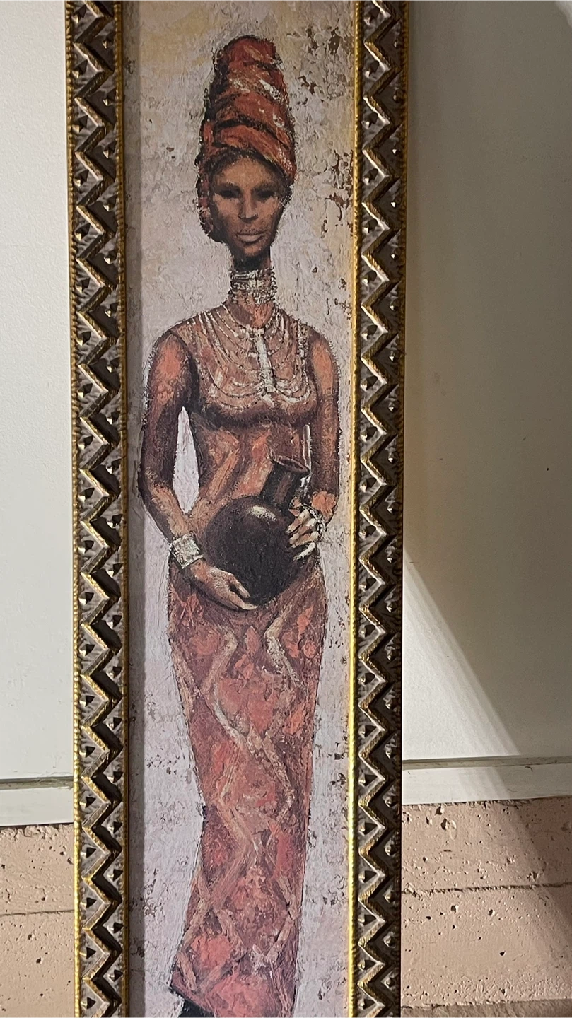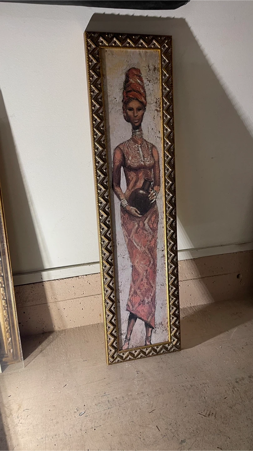 Framed art from Reflections Gallery in Victoria, BC. The frame is gold and the art depicts a woman holding a vase.