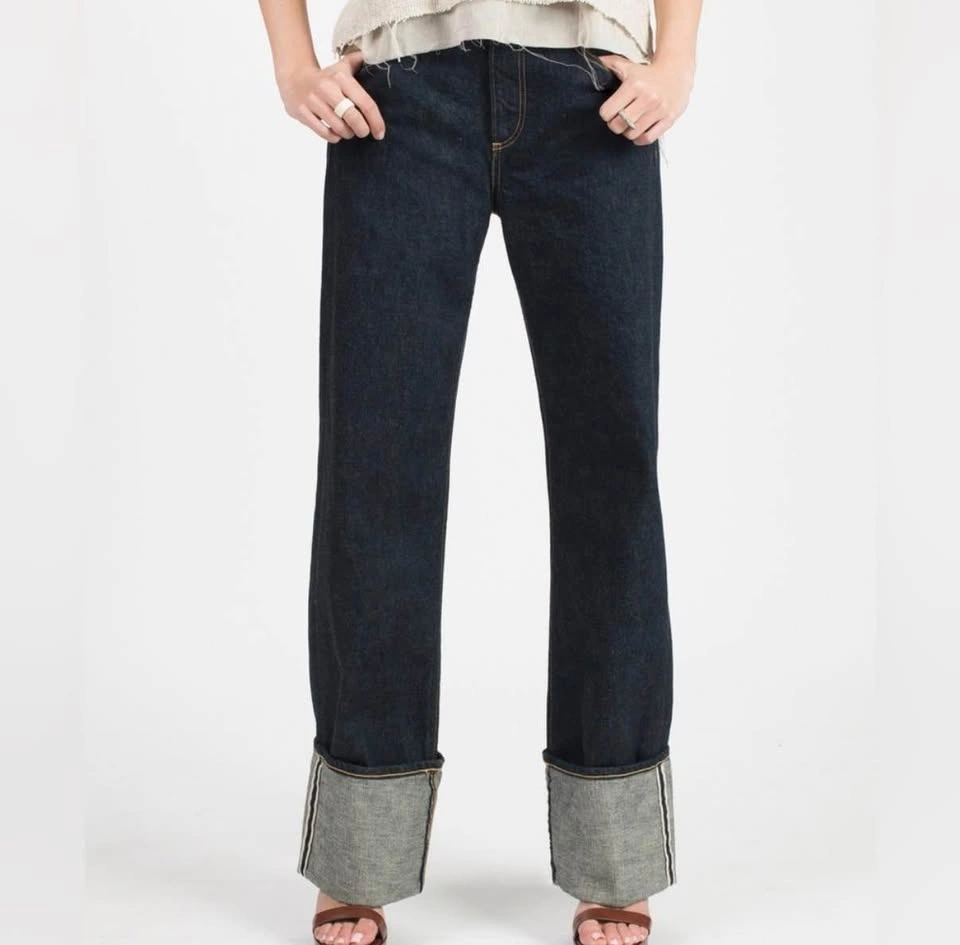 Simon Miller's Zuna Wide Leg Jeans in mid-rise dark indigo Japanese denim. Features an exaggerated cuff with contrasting thread, branded button closure, zipper fly, five-pocket style, and belt loops. Relaxed fit with a straight leg and a wide yoke at the back. Made in the USA from 100% cotton.
