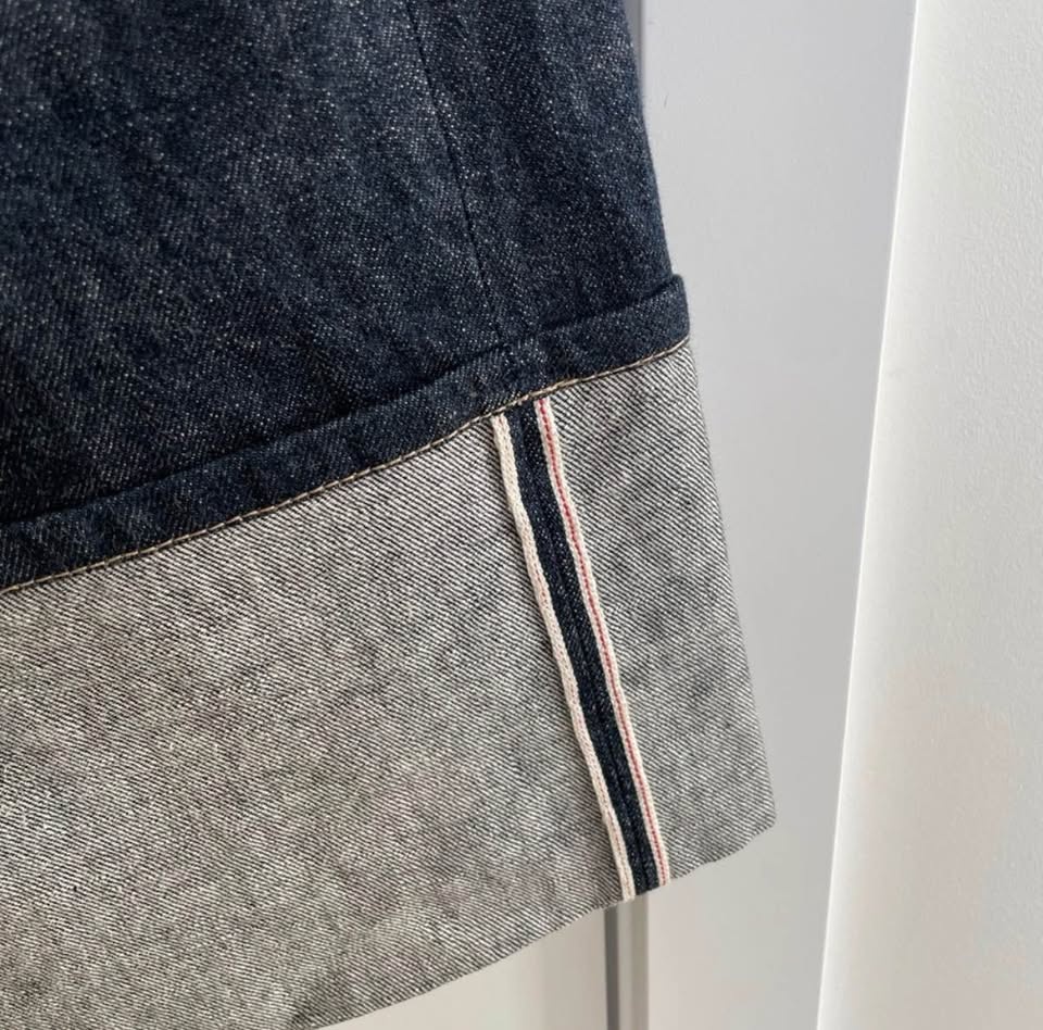Simon Miller's Zuna Wide Leg Jeans in mid-rise dark indigo Japanese denim. Features an exaggerated cuff with contrasting thread, branded button closure, zipper fly, five-pocket style, and belt loops. Relaxed fit with a straight leg and a wide yoke at the back. Made in the USA from 100% cotton.