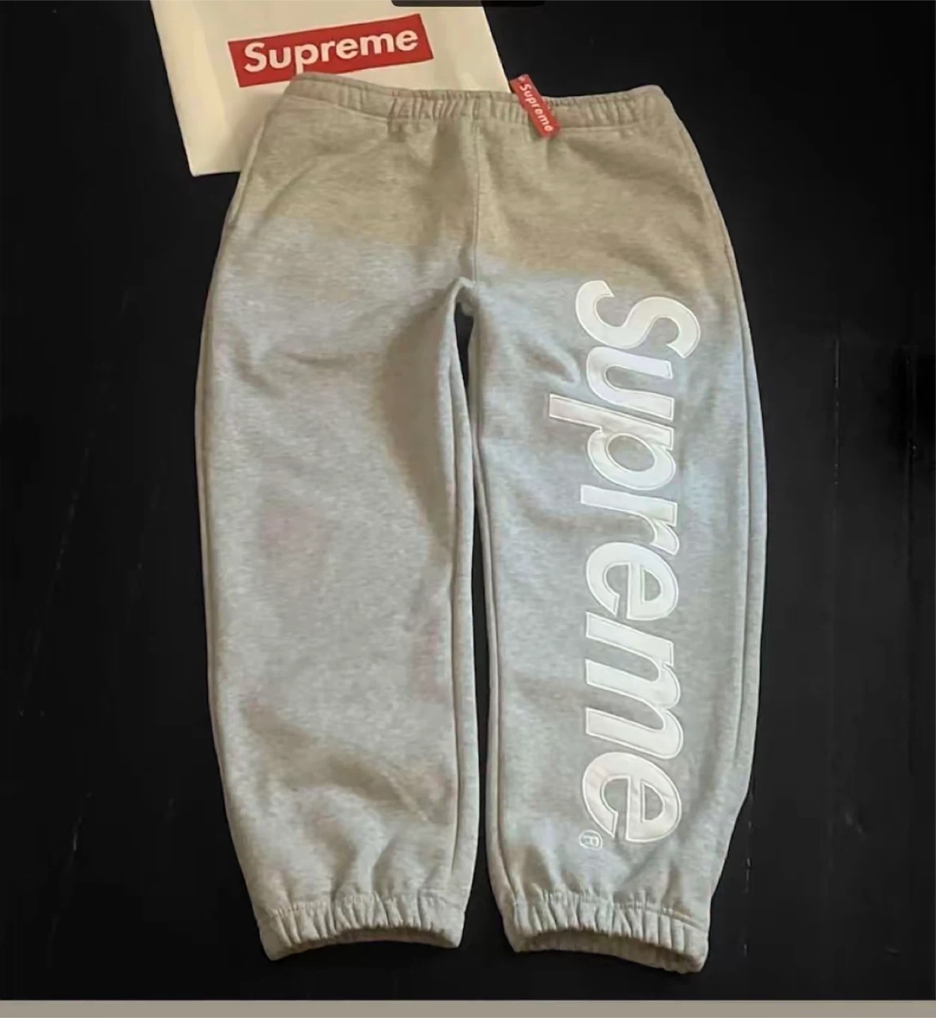 Three Supreme sweatpants available in black and grey. Sizes S and M. They feature the iconic Supreme logo printed vertically on the side. Made for comfort and style, these pants are perfect for casual wear. Get yours today!
