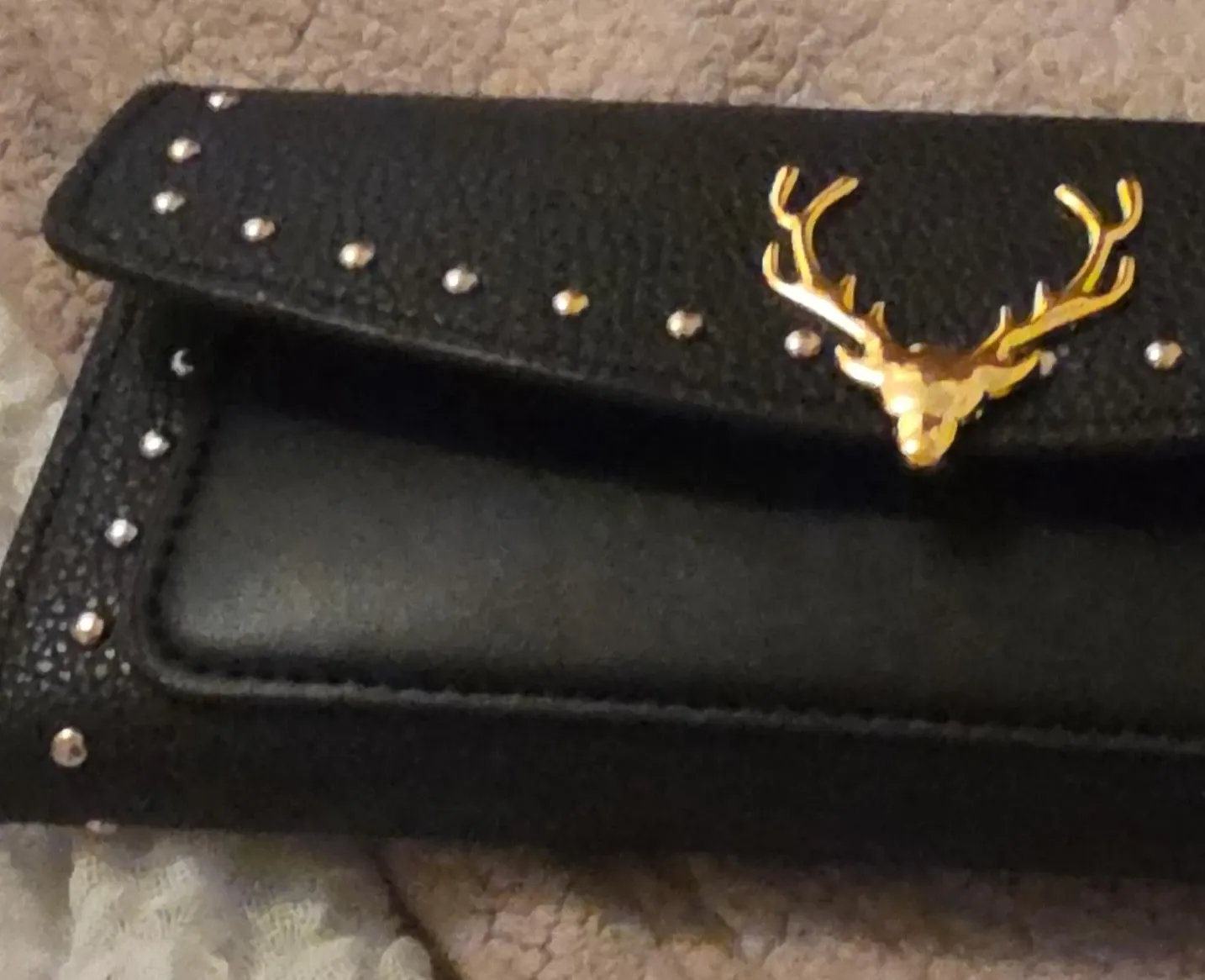This black clutch wallet features a textured faux leather finish and is adorned with silver studs. It has a prominent gold-toned deer head emblem on the front flap for a stylish touch. The interior is a solid black.