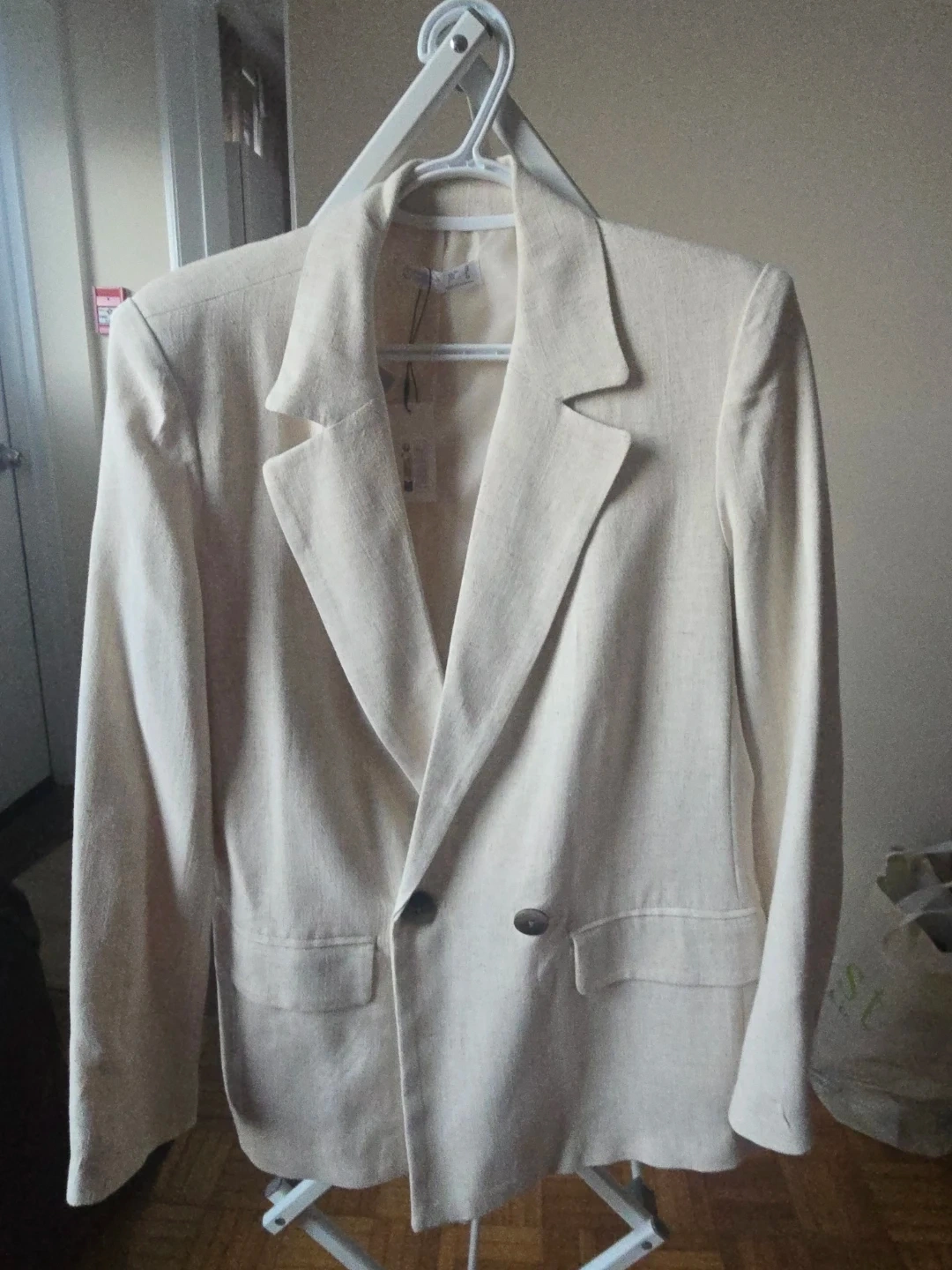 Stylish cream blazer made from a linen blend. It features a double-breasted closure and two front pockets. Perfect for layering over tops or dresses!
