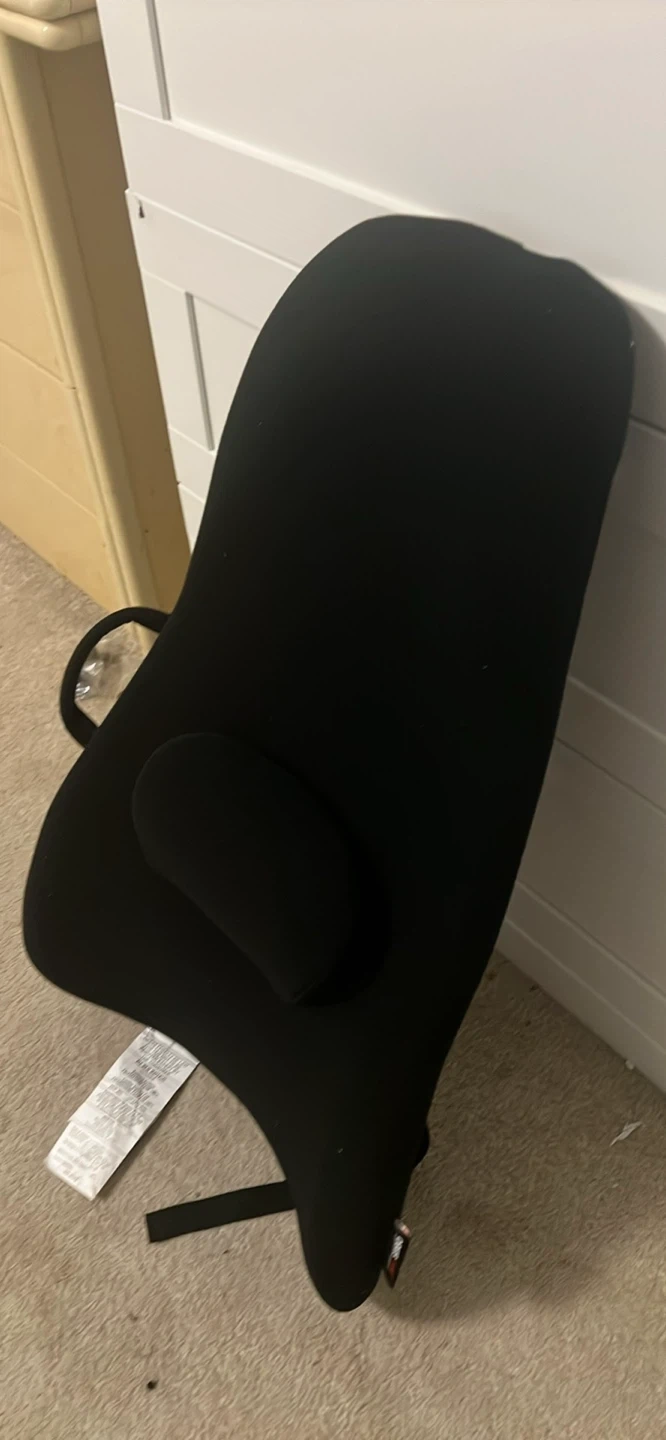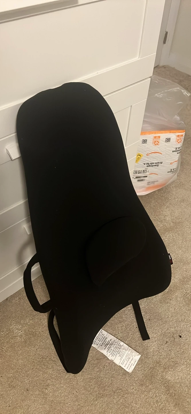 Black lumbar support pillow with adjustable straps. Helps improve posture while sitting. Offers comfort for long periods. No box but never actually been used.