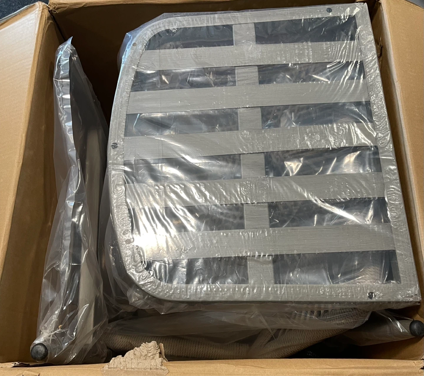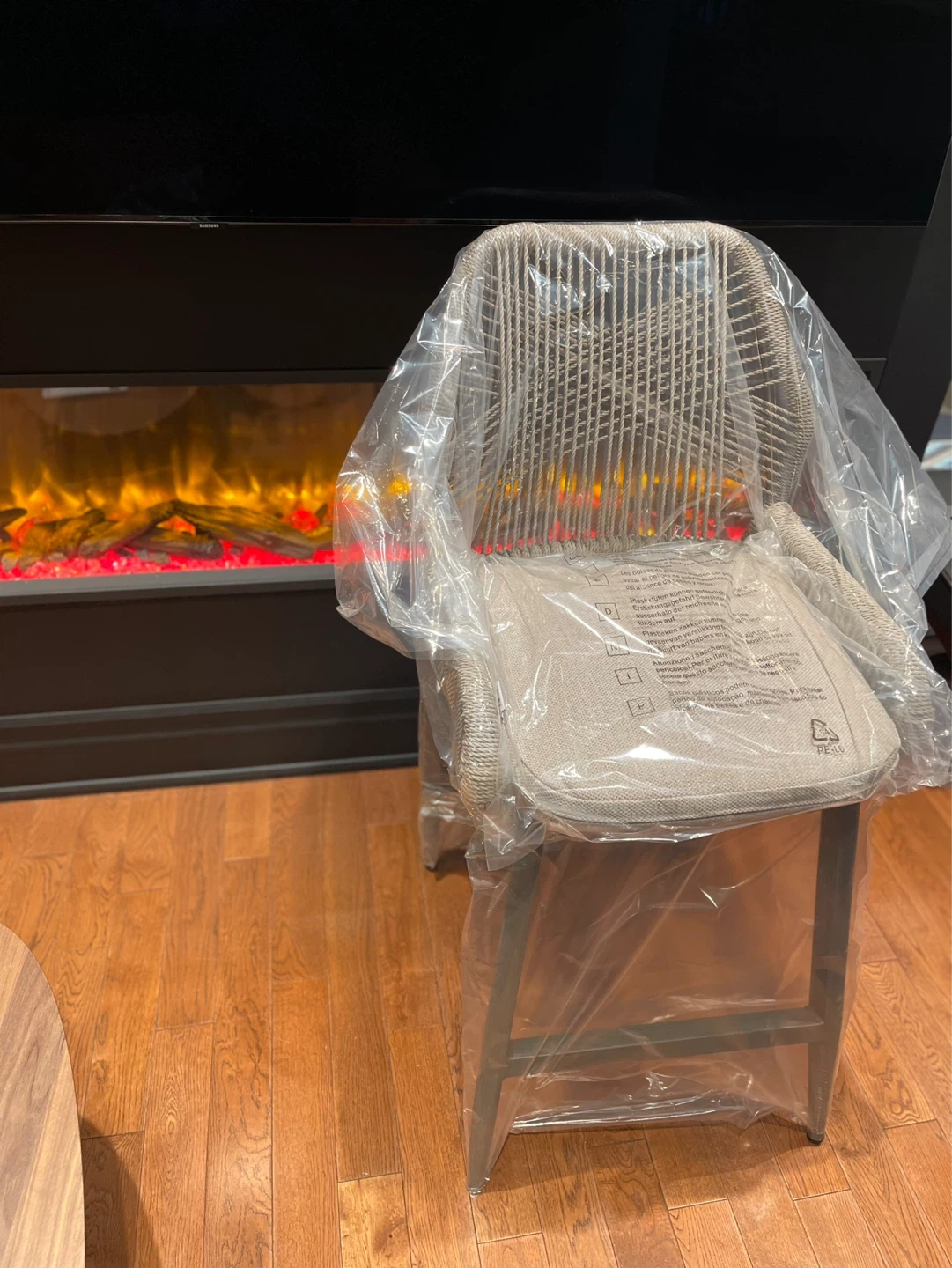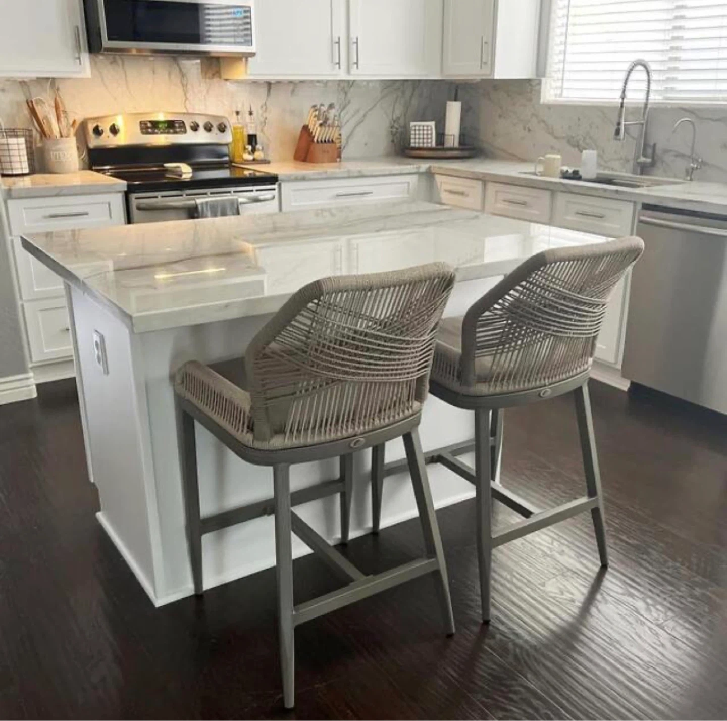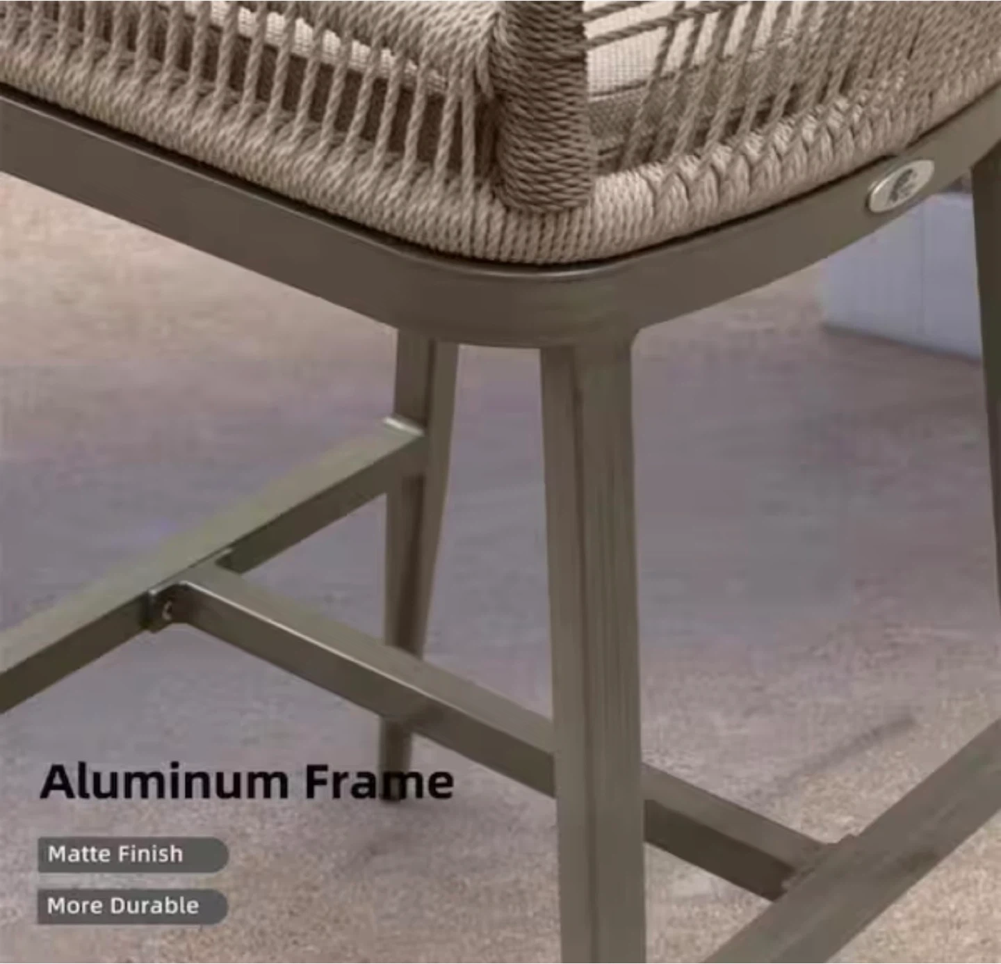Still in the box and never used, these stools feature a stunning "cross-weave" design using weather-resistant Textilene rope in a chic beige and grey mix. They are built on a heavy-duty, wood-grain powder-coated aluminum frame that gives you the beauty of wood with the durability and rust-resistance of metal.
