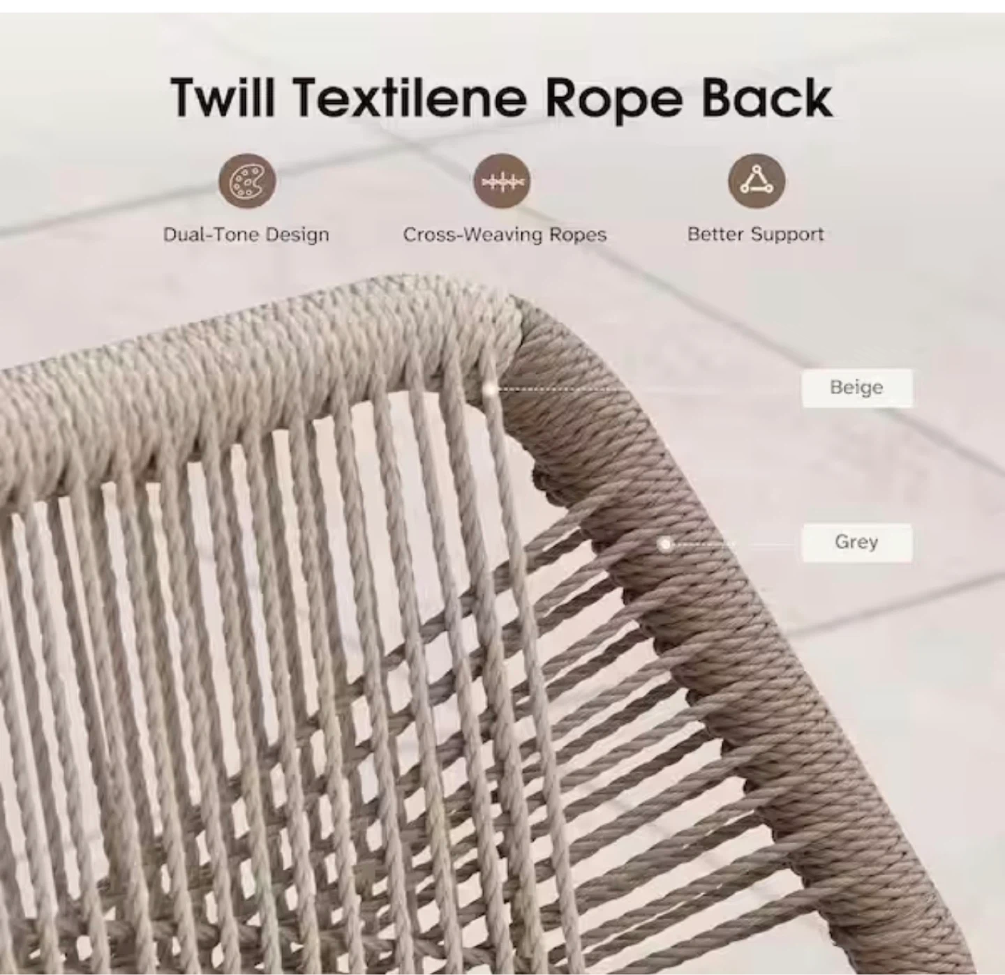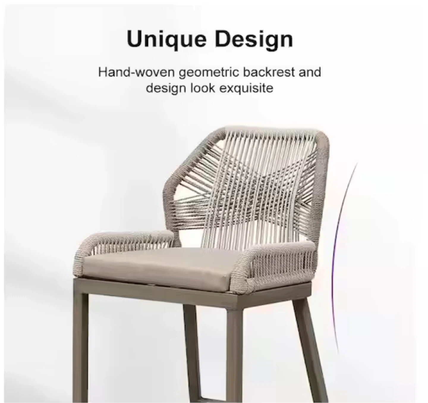 Still in the box and never used, these stools feature a stunning "cross-weave" design using weather-resistant Textilene rope in a chic beige and grey mix. They are built on a heavy-duty, wood-grain powder-coated aluminum frame that gives you the beauty of wood with the durability and rust-resistance of metal.