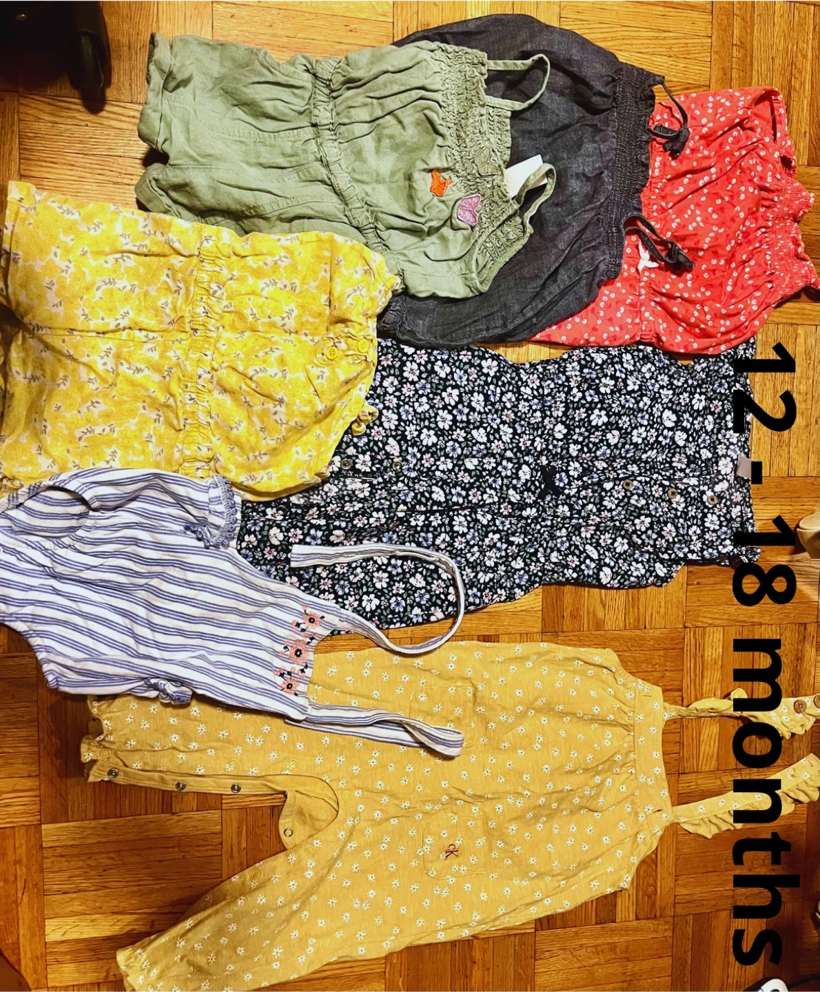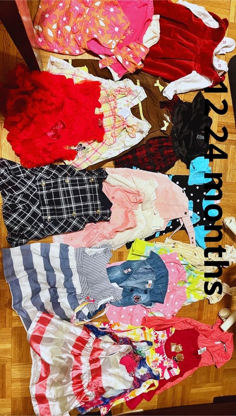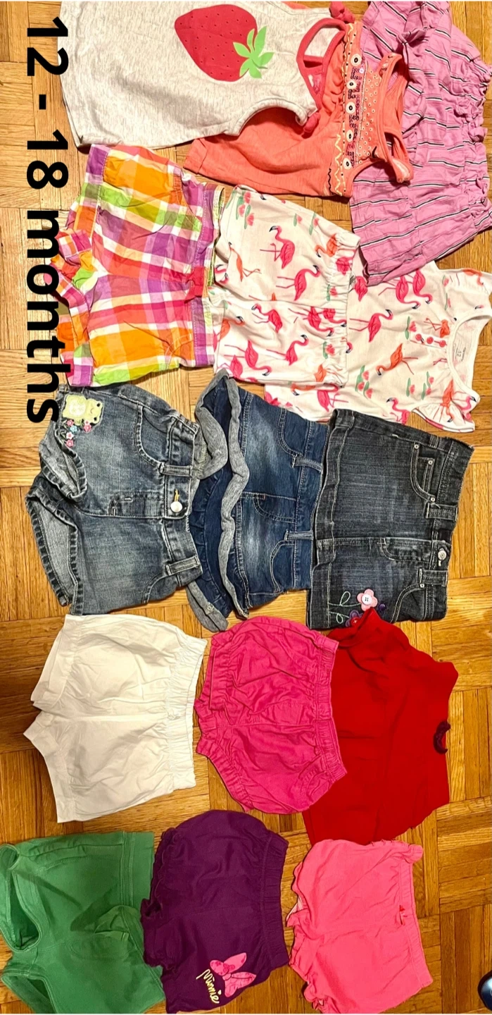 * Lot 12 -18 months includes 25 dresses, 8 onesies, 7 bodysuits, 15 pairs of pants + 3 pairs of rain pants, 4 outfits, 11 blouses, 8 sweaters, 7 jumpsuits, 14 pairs of shorts and skirts.