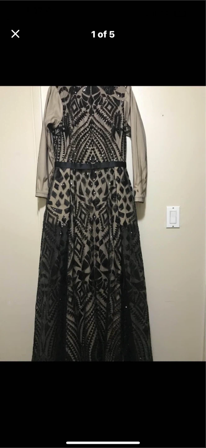 A stunning black sequined mesh evening gown with long sleeves and a satin ribbon belt. It features an intricate geometric sequin pattern throughout the bodice and skirt. This dress is perfect for a formal event or special occasion! Worn couple hours cost me 400