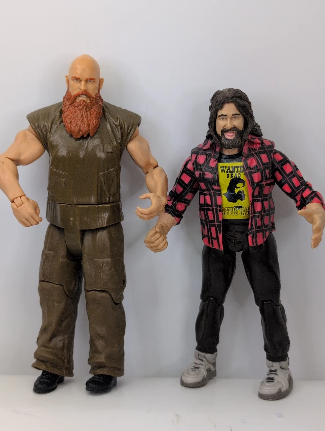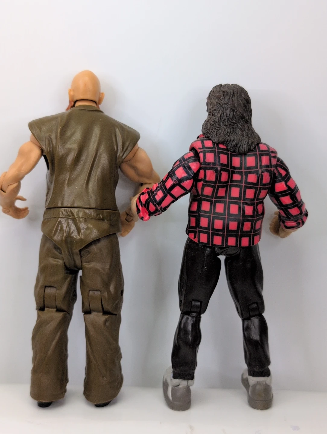 Two wrestling action figures included. One figure has a bald head and a brown outfit, while the other has long hair and wears a red and black plaid shirt over a yellow t-shirt. They're ready for the ring!