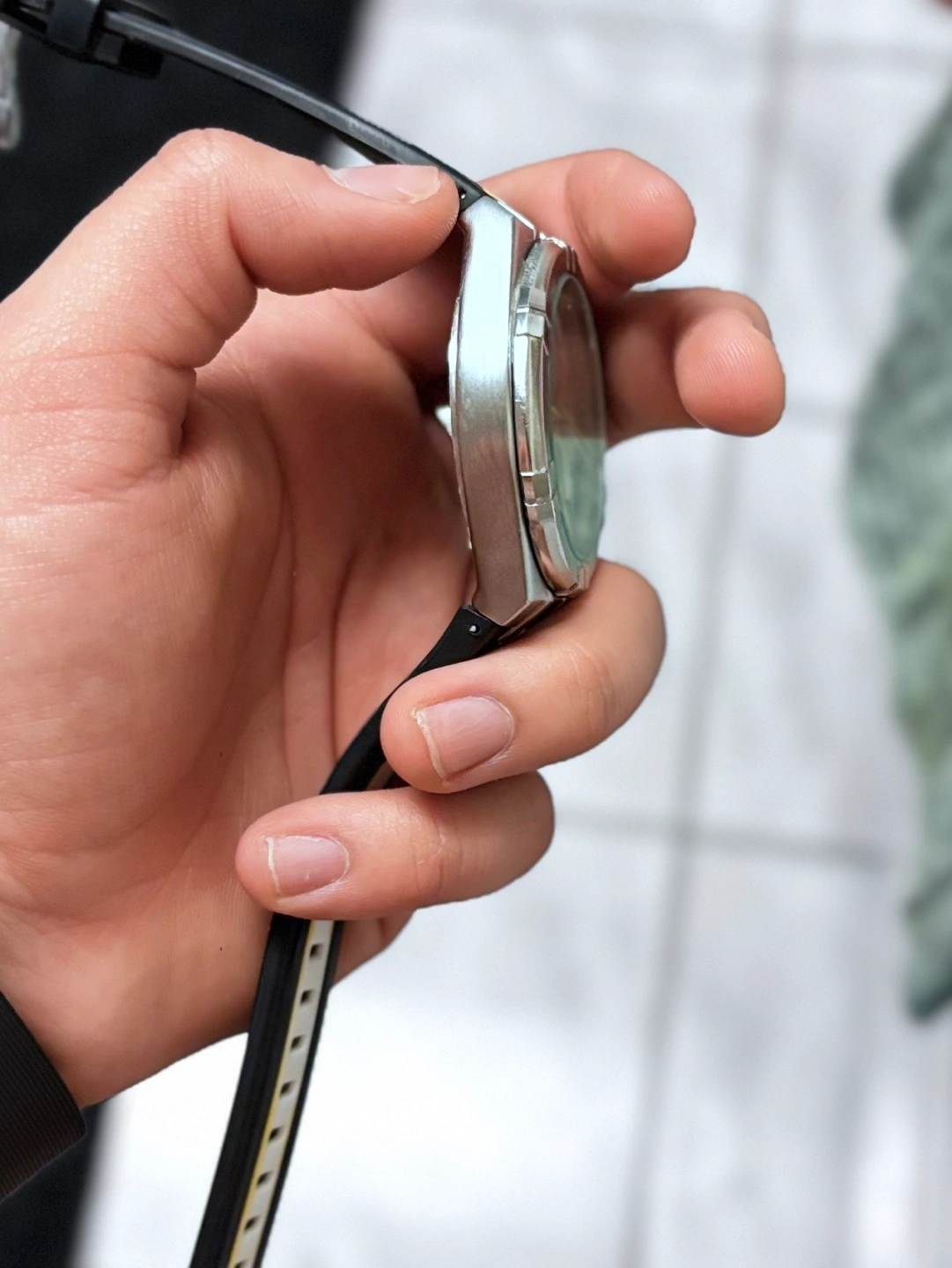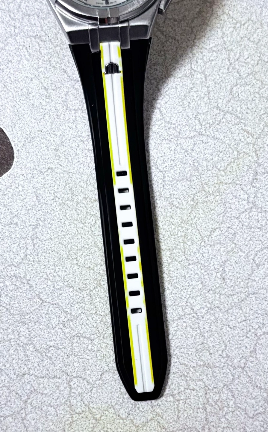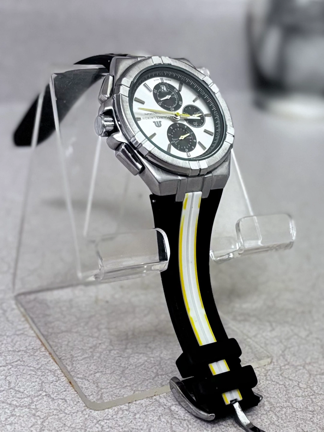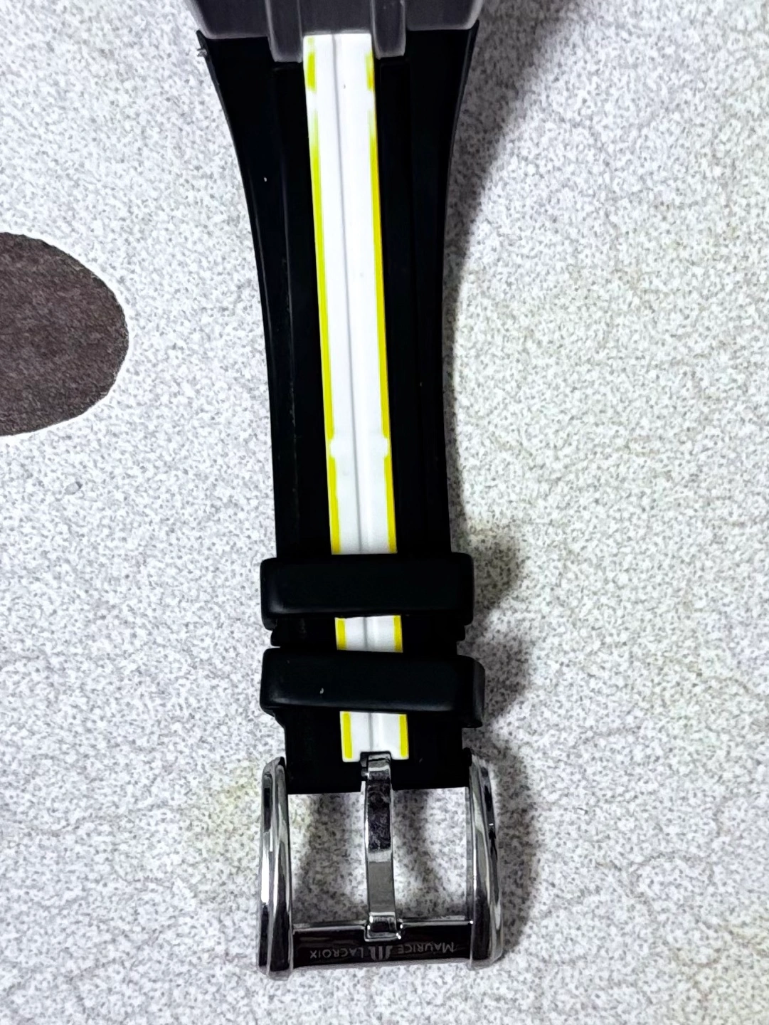 Maurice Lacroix Men's wristwatch. Silver-toned stainless steel case. White face with chronograph subdials. Black silicone band with yellow and white stripes. Quartz movement.