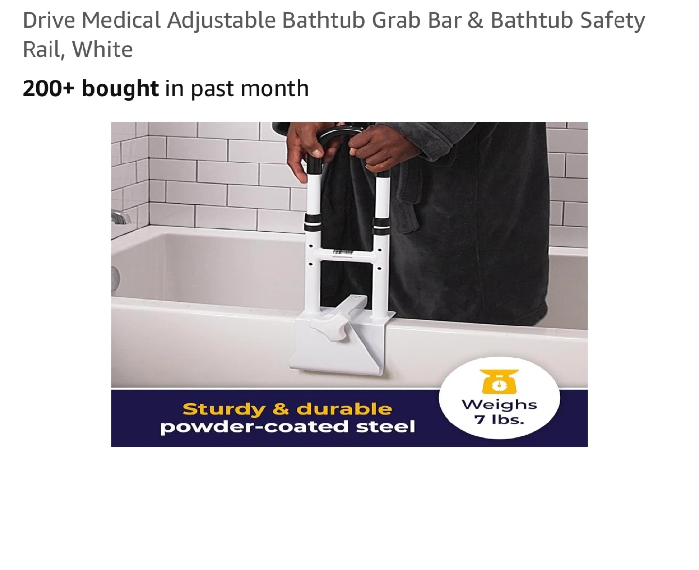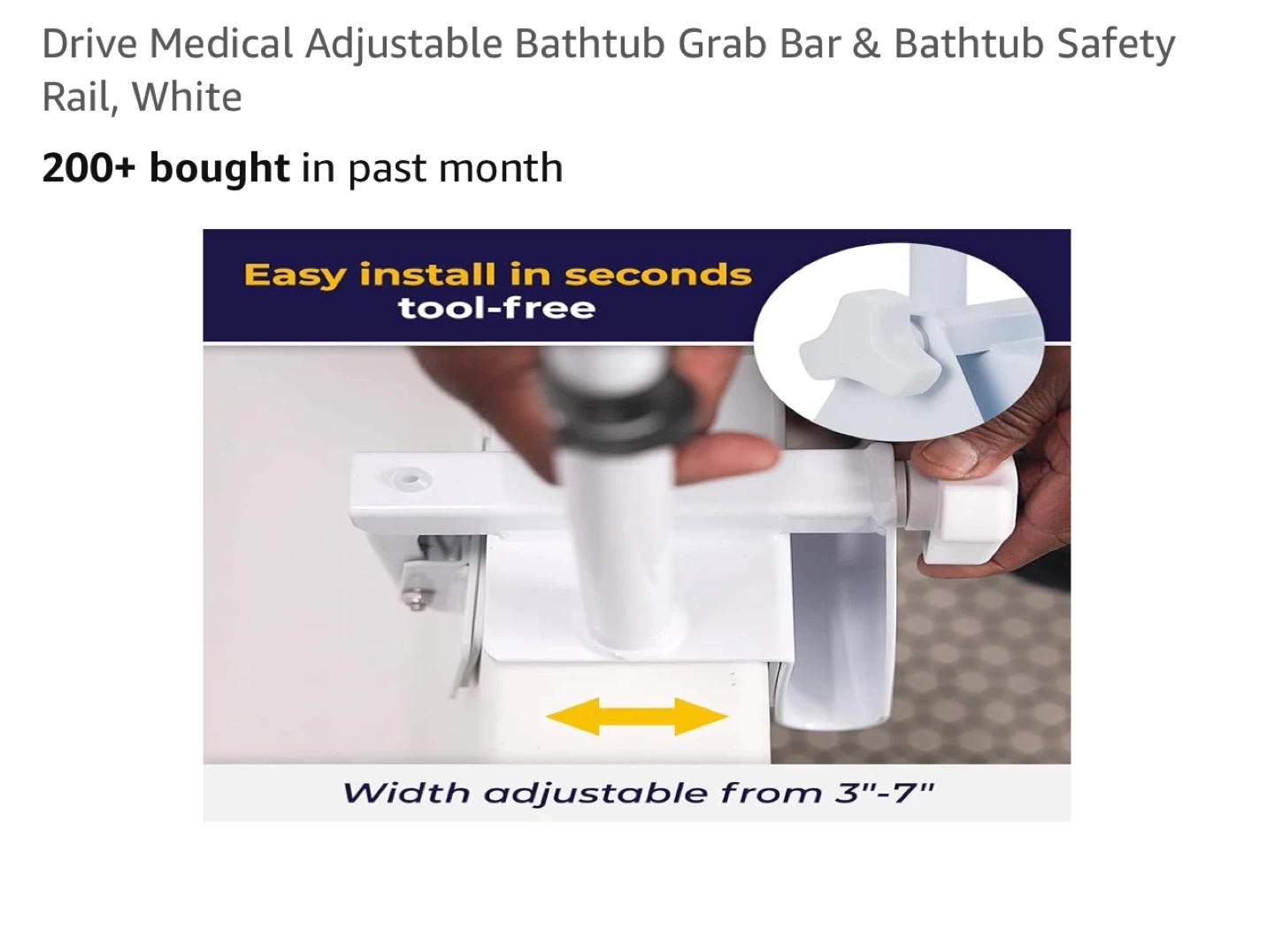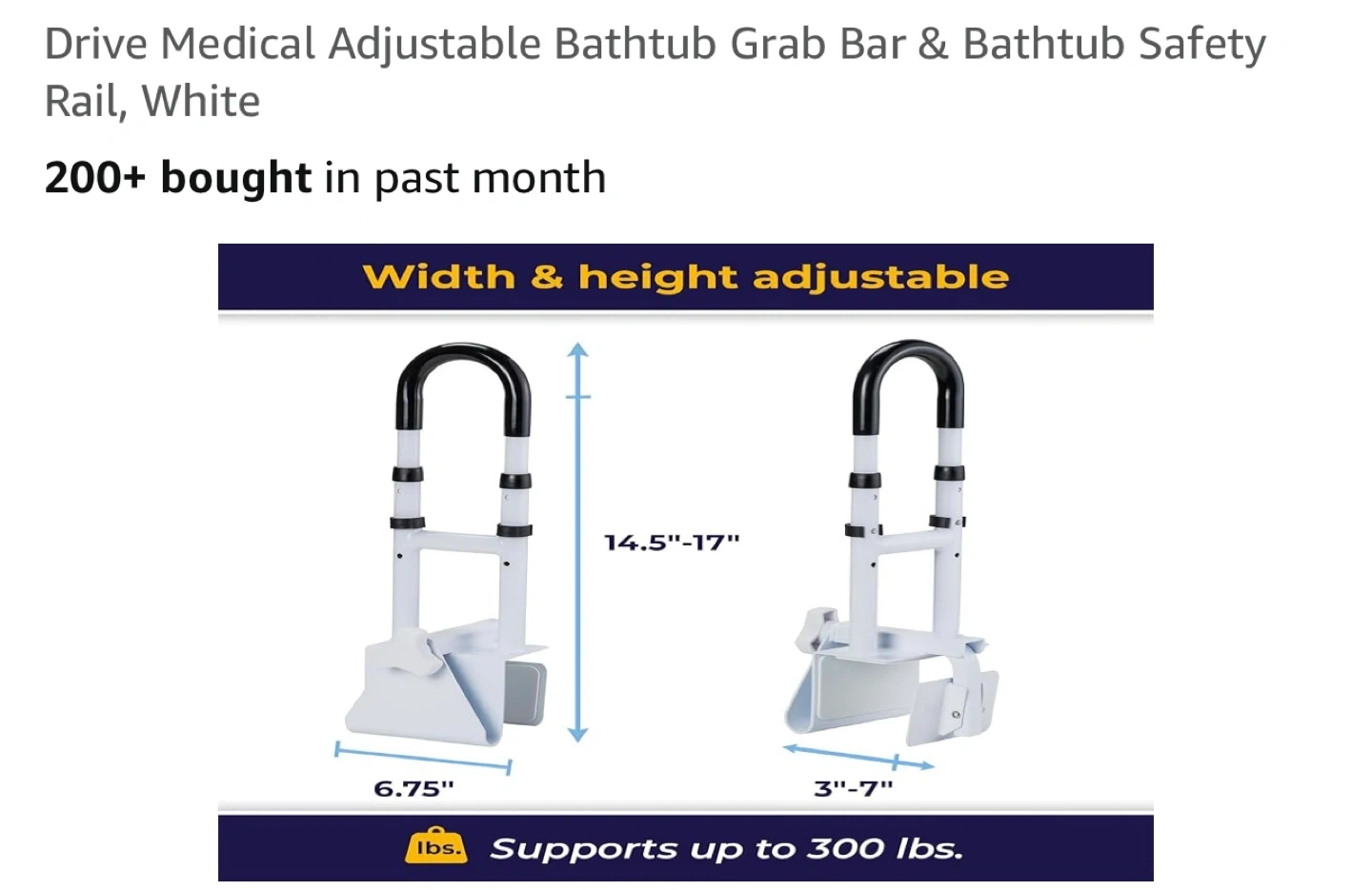 This Drive Medical adjustable grab bar provides stability and balance for independent bathing. It's made of sturdy, durable powder-coated steel and supports up to 300 lbs. The width adjusts from 3"-7" and height from 14.5"-17". It features an enhanced safety non-slip handle and installs tool-free in seconds. Who would this be useful for? Anyone seeking extra support in the bathtub!