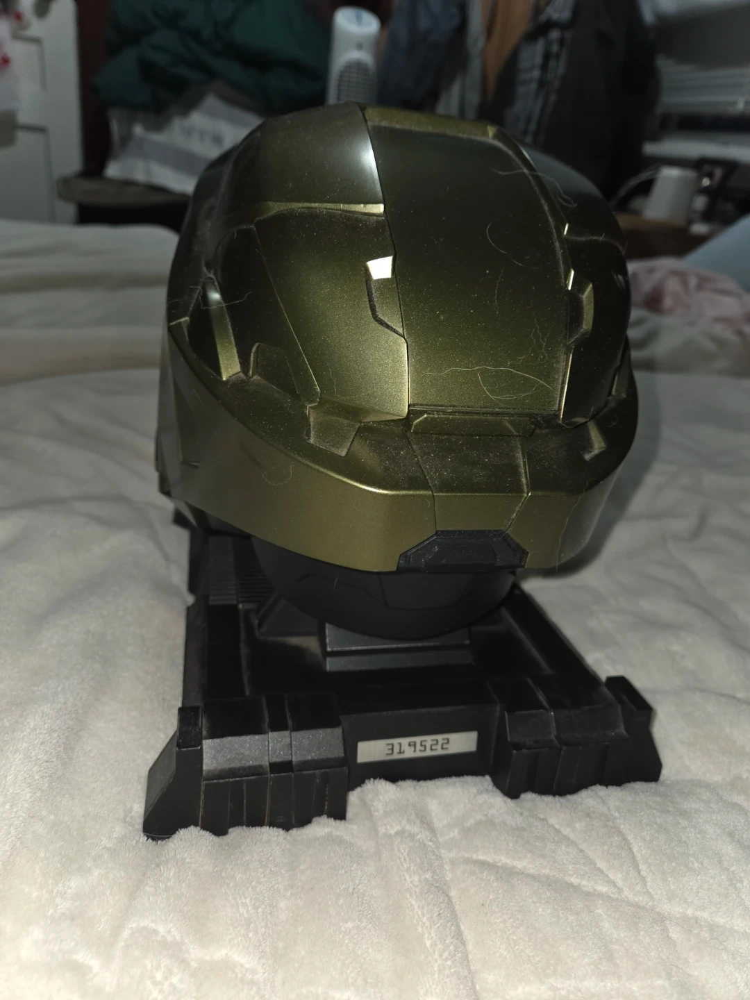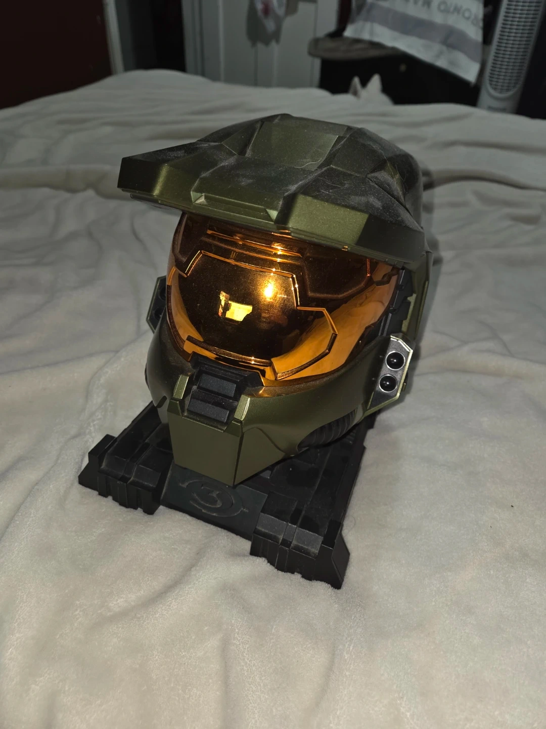 This is a replica of Master Chief's helmet from the Halo 3 video game. It comes with a display stand. It's green with an orange visor. Fits 3 video game cases.